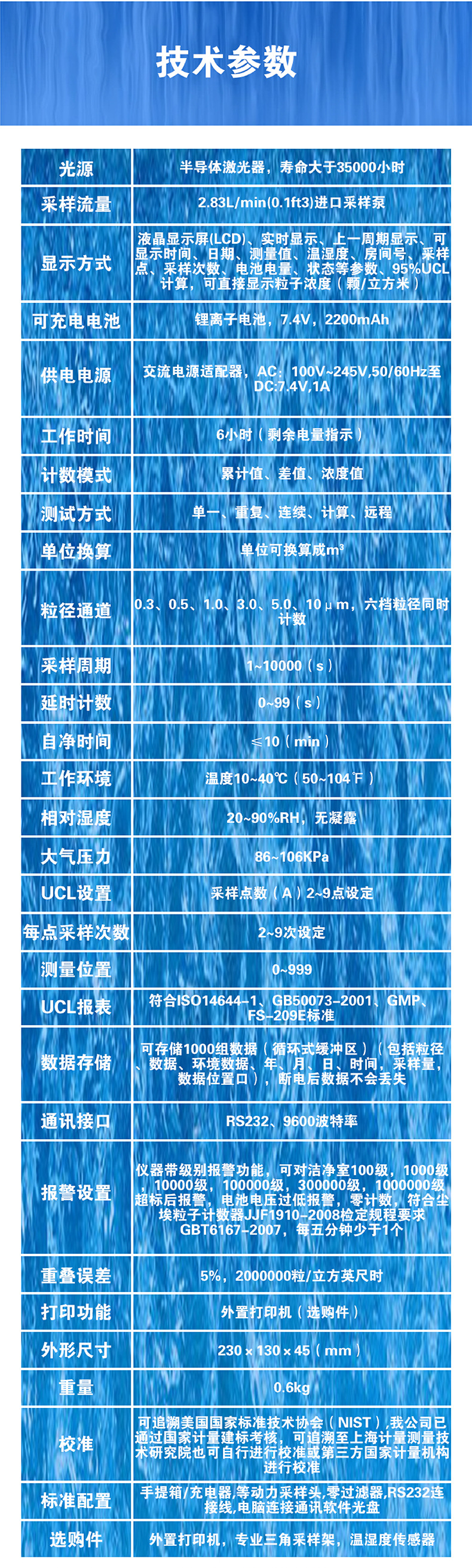 仕様 レーザー粉塵粒子カウンター
