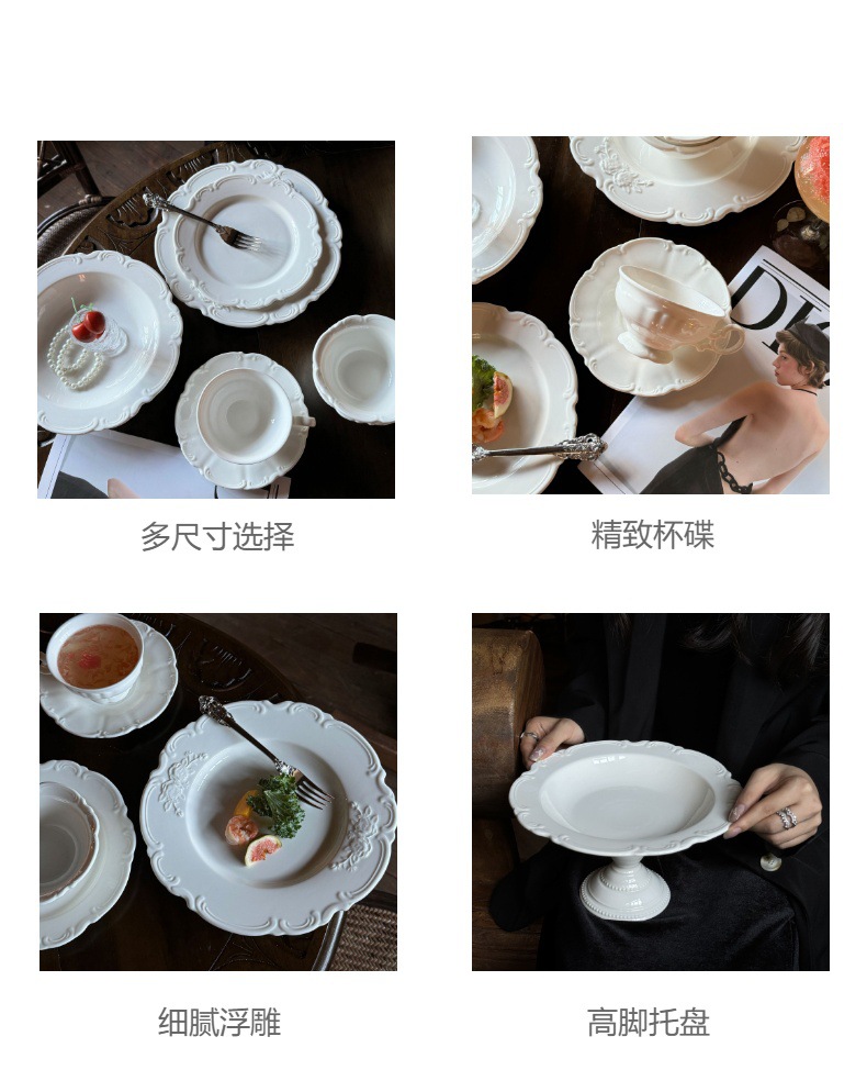 レトロなフランス式レリーフレース純白レースセラミック食器カップ高足盤中古重工シリーズ