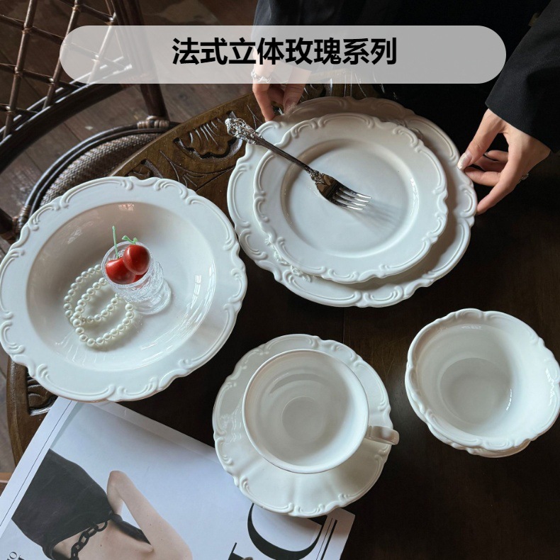 フランスの逃亡王女美しいレリーフ花柄セラミックプレートボウルデザートプレートスーププレート食器セット在庫卸売
