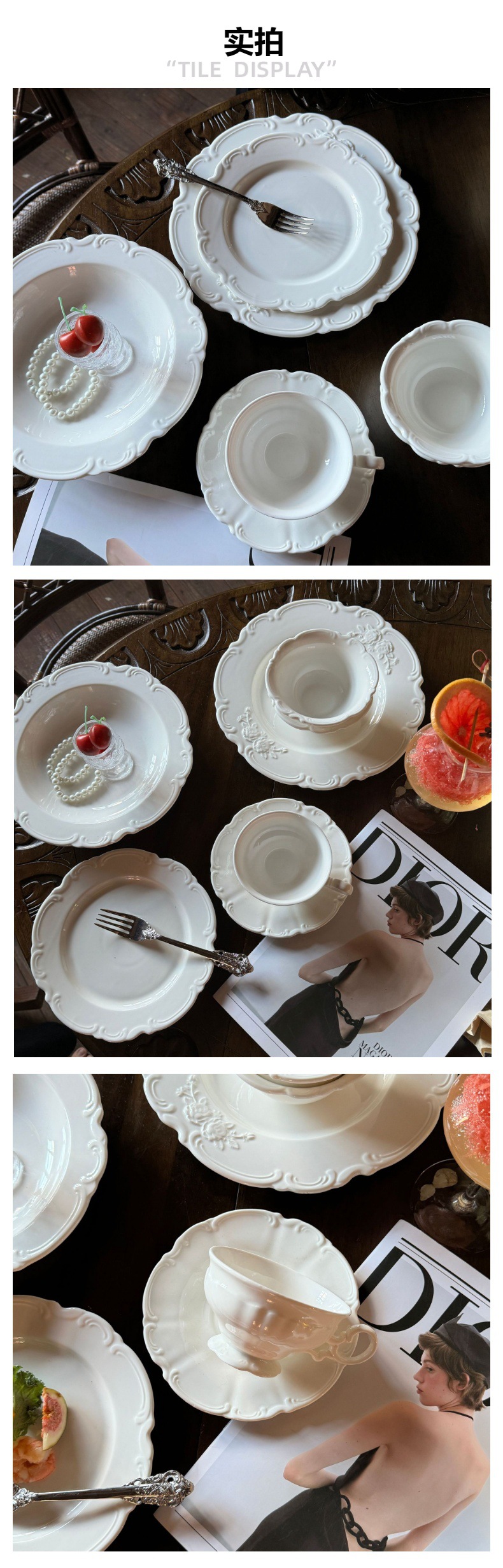 复古法式浮雕蕾丝纯白花边青花陶瓷餐盘碗杯高脚盘重工系列批发