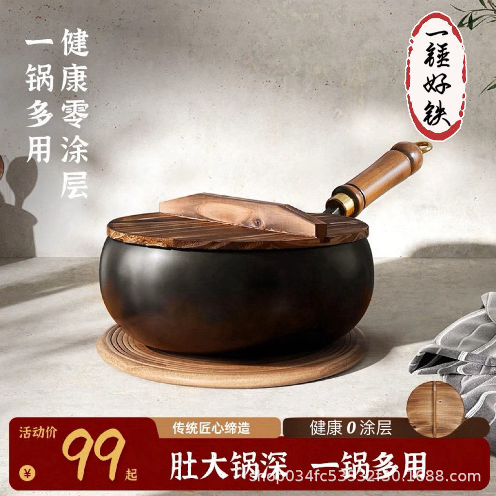 工場直販本物の張丘手作り鉄鍋伝統的な非コーティングノンスティックポット昔ながらの木製ハンドル黒鍋丸底家庭用