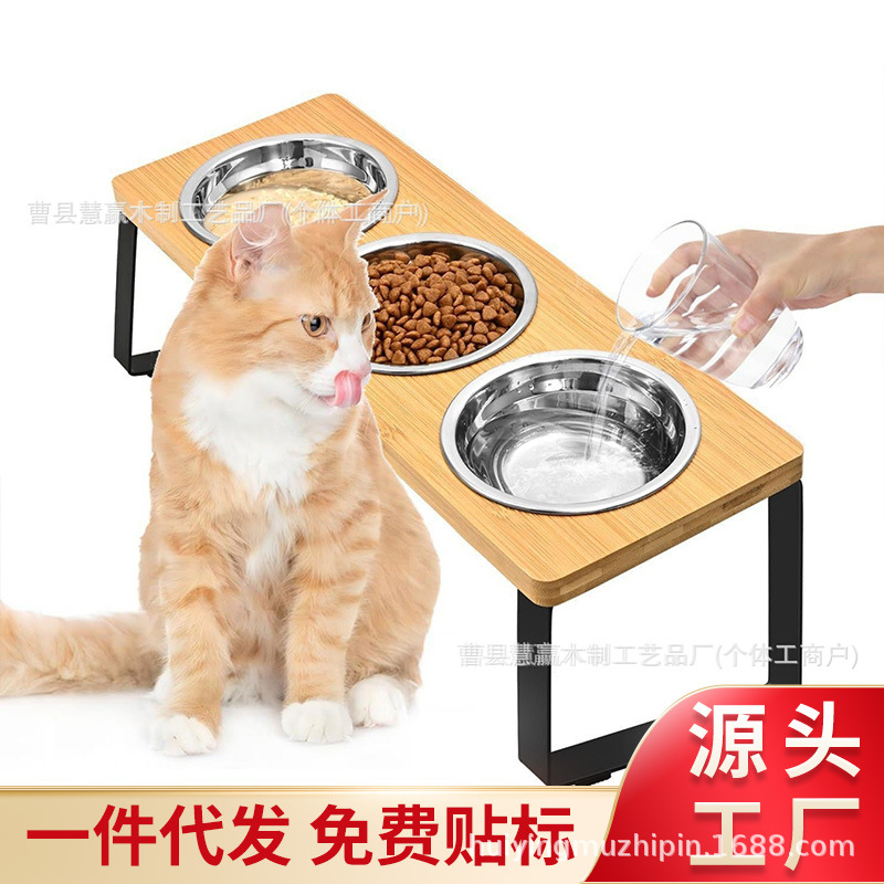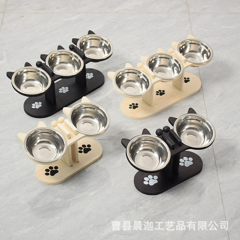 现货木质宠物猫碗架立式斜口狗狗饮水架倾斜护颈椎三合一猫碗架子