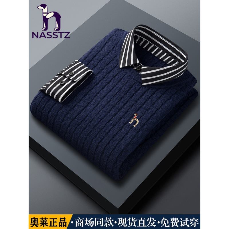 【奥莱正品】假两件羊毛衫男士冬季条纹衬衫领加厚羊绒毛衣打底衫
