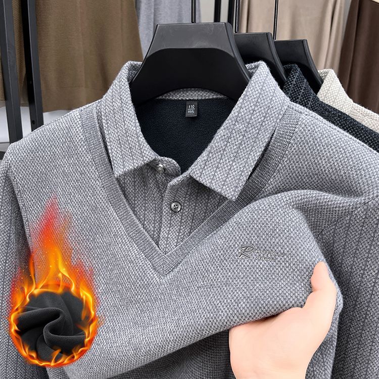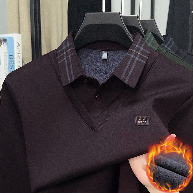 直播爆款男士加绒Polo衫秋冬新款高级感加厚一体绒保暖假两件上衣
