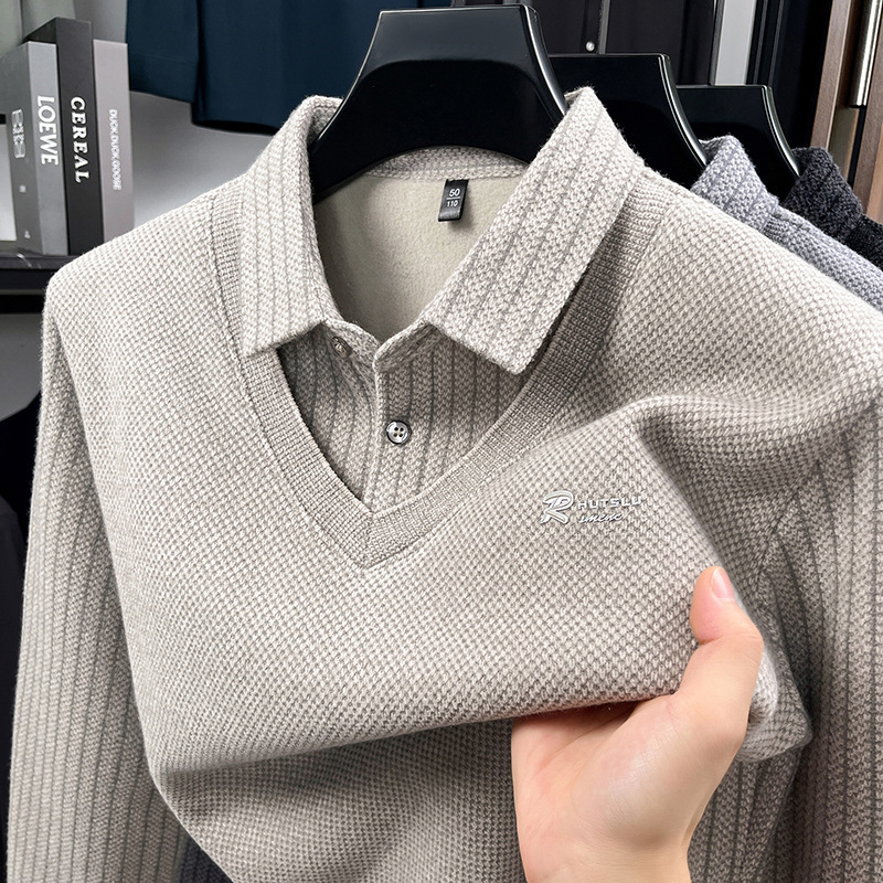 男士假两件翻领加绒毛衣冬季新款加厚保暖中青年打底针织衫上衣男