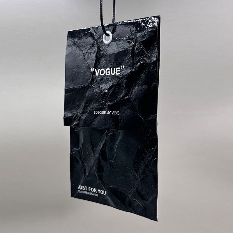 特殊な材質の黒い手で紙のつり札をつかんで、明るい黒のしわの紙のファッションのブランドの服の商標を注文して注文します。