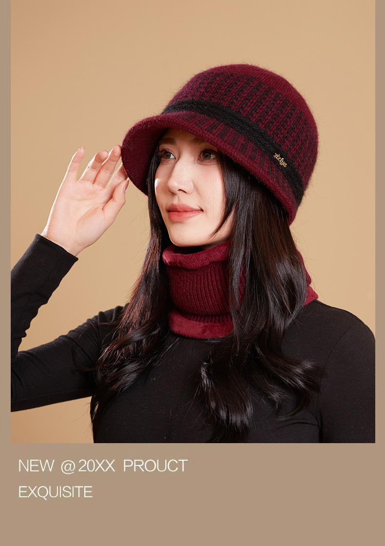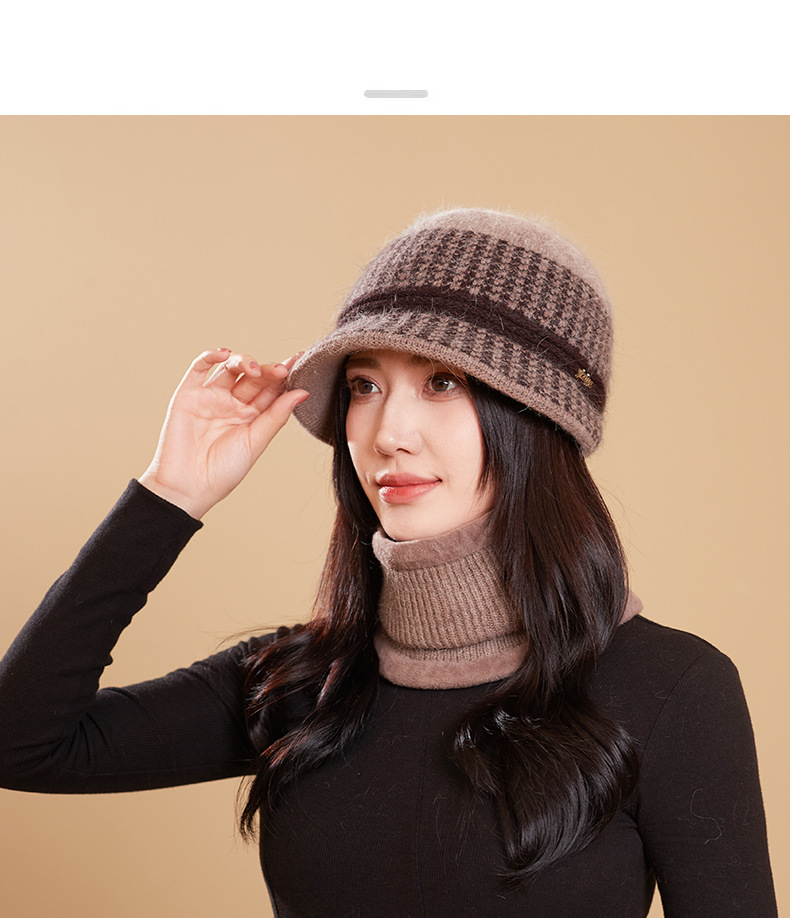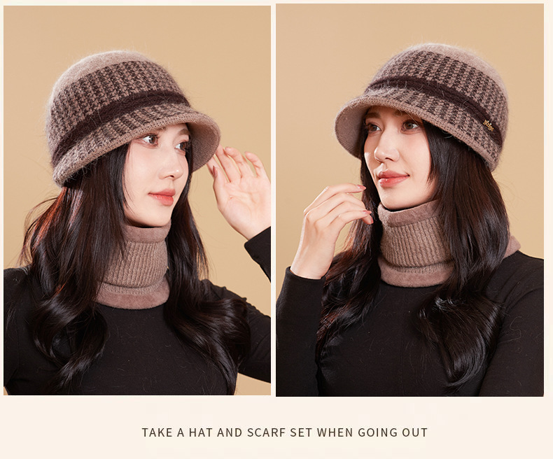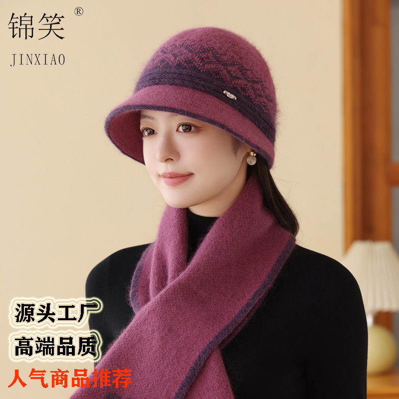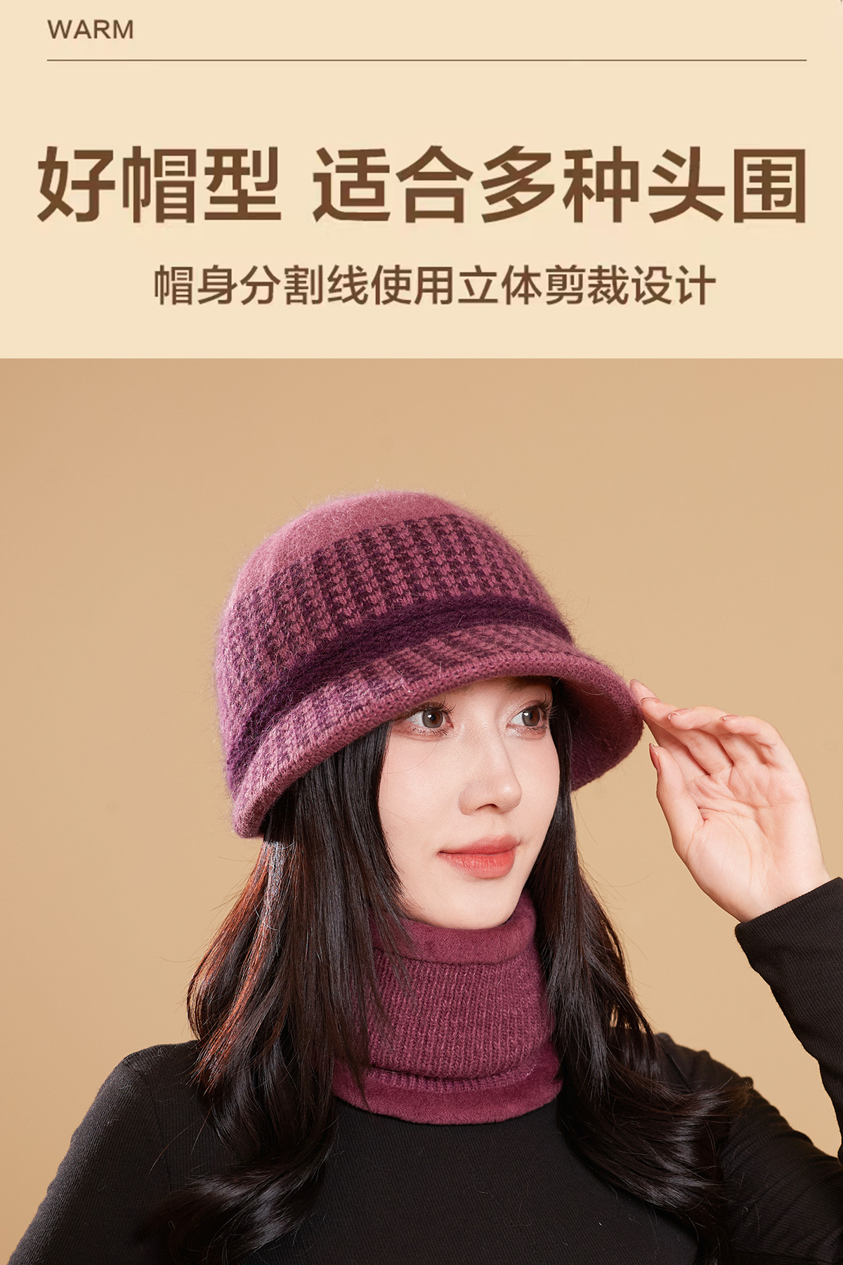 25秋冬季新款拼色保暖中老年妈妈帽子兔毛针织护耳盆帽围巾两件套