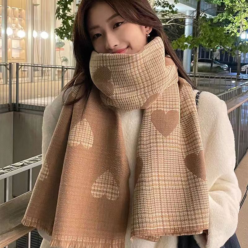 新作ハート柄チェック柄スカーフ 秋冬 韓国風雰囲気 イミテーションカシミヤショール 両面使える万能暖かいネックウォーマー レディース