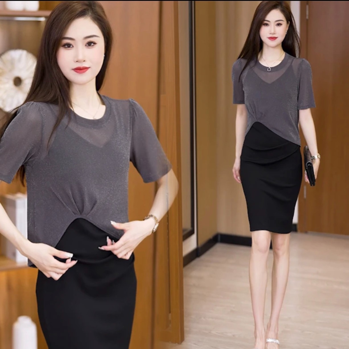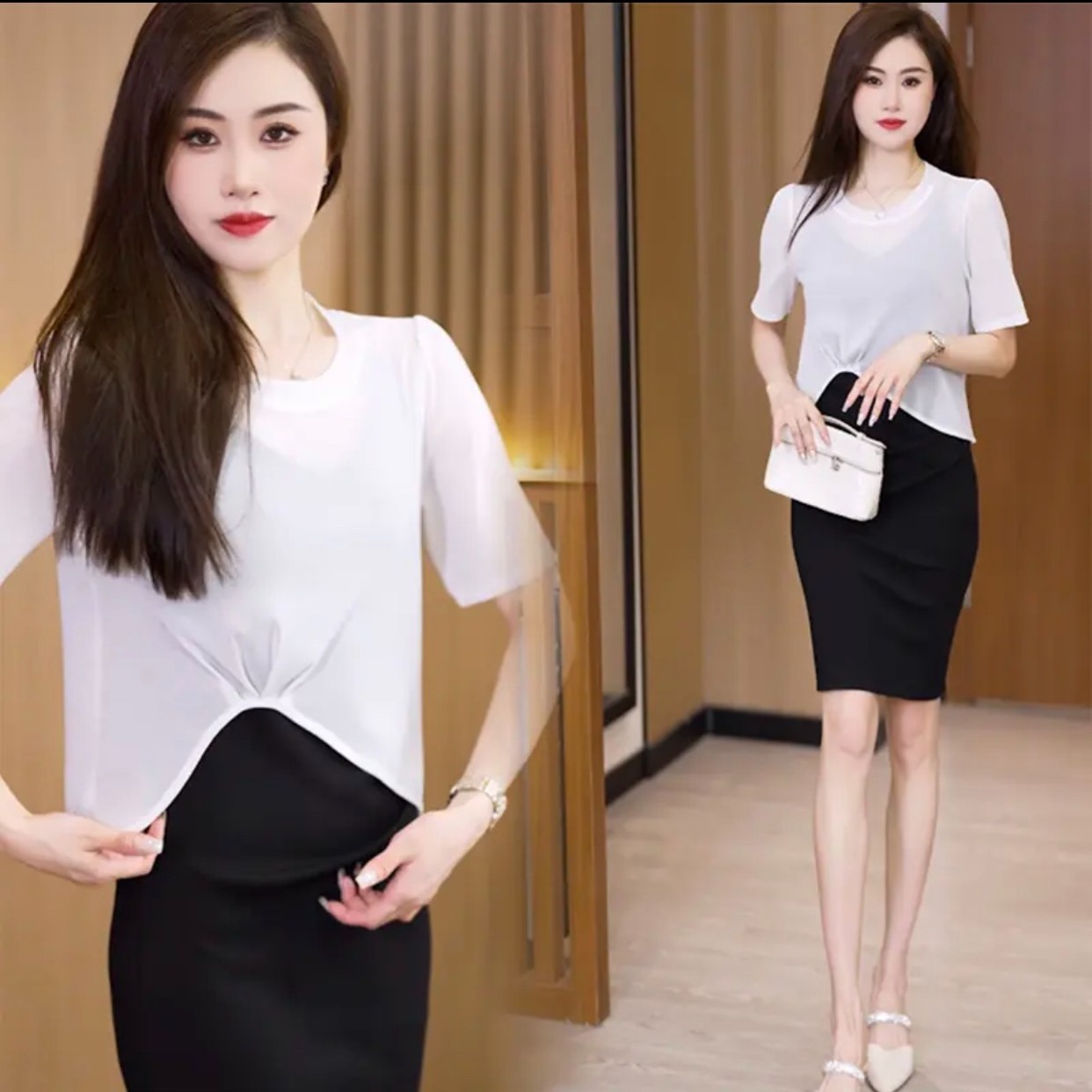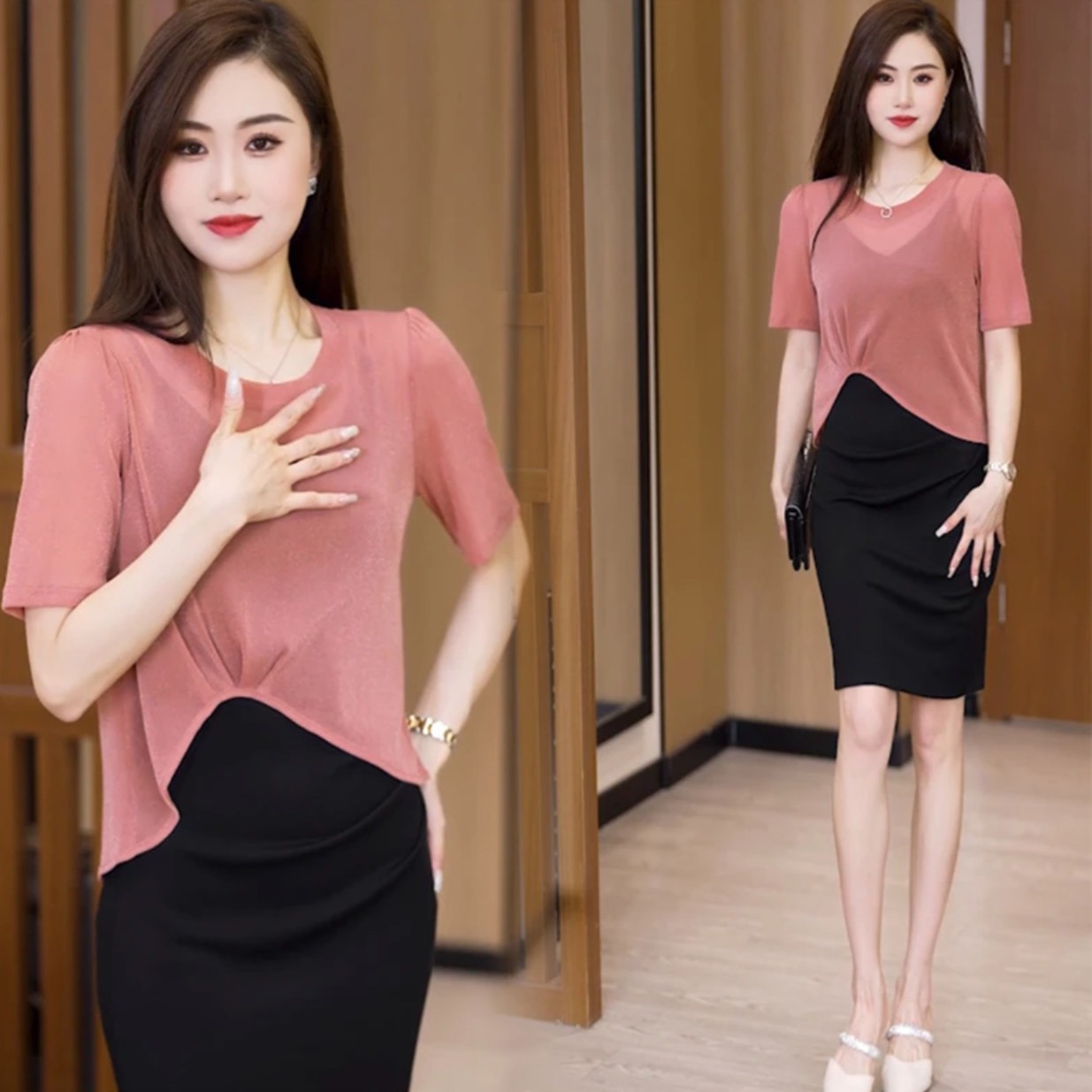 ネットセレブ人気夏シルバーシルククールシースルーシンプルデザインダブテールファッションカジュアル万能ミッドスリーブTシャツ女性用