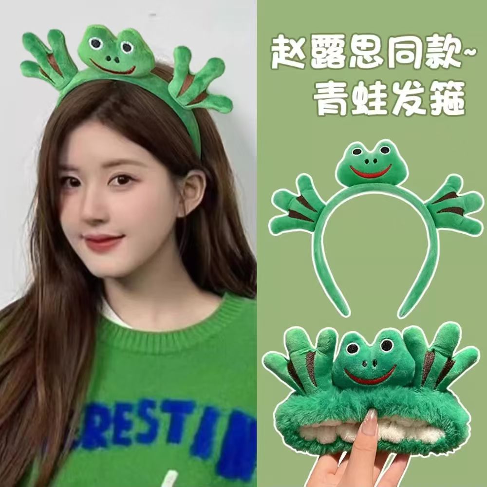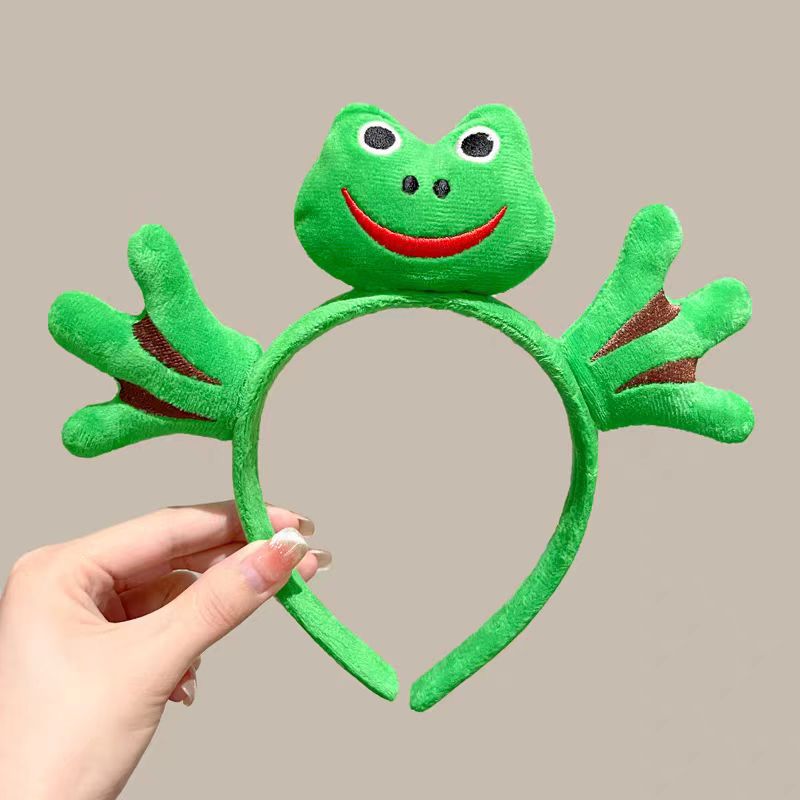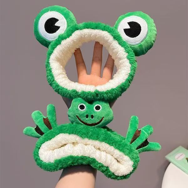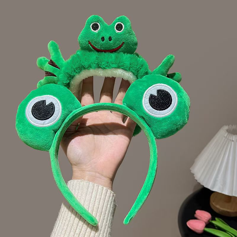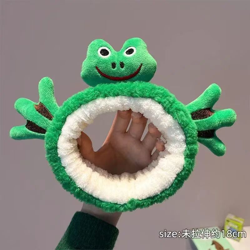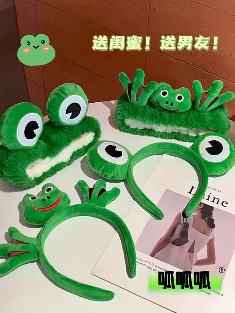 カエルのカチューシャが可愛いです。女性の顔を洗って化粧する専用のカチューシャをつけます。