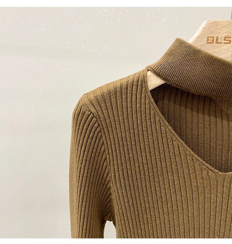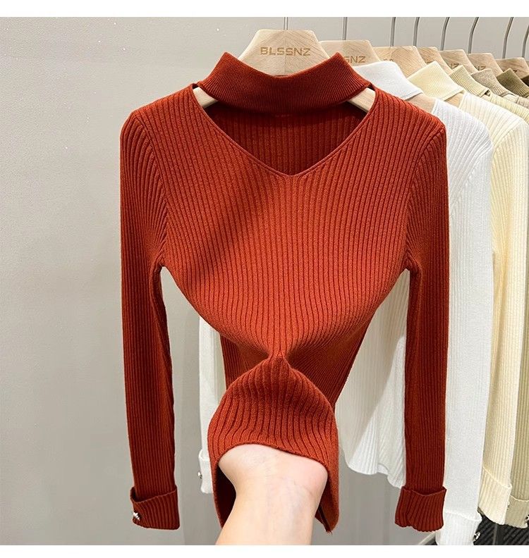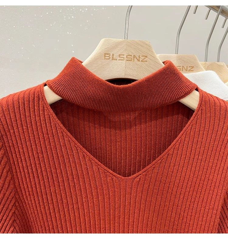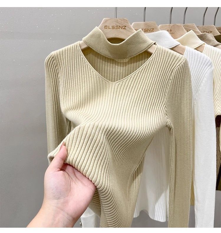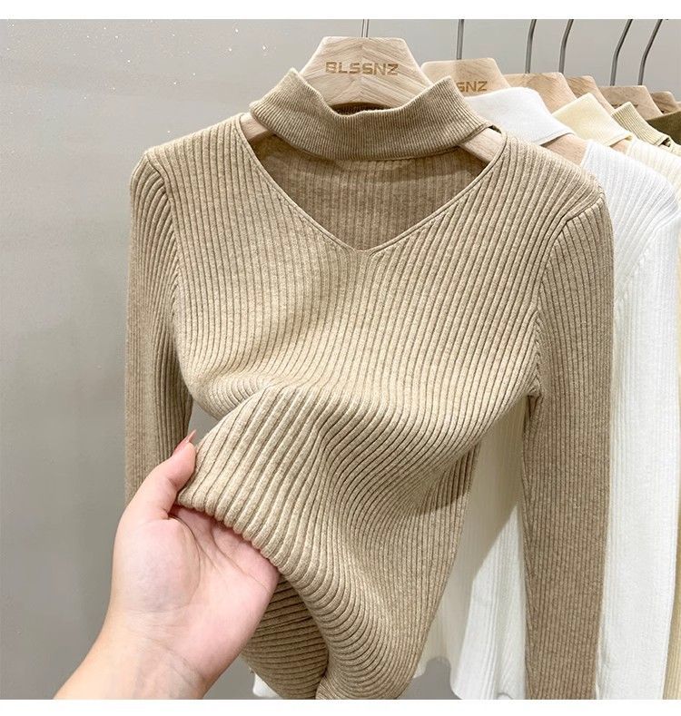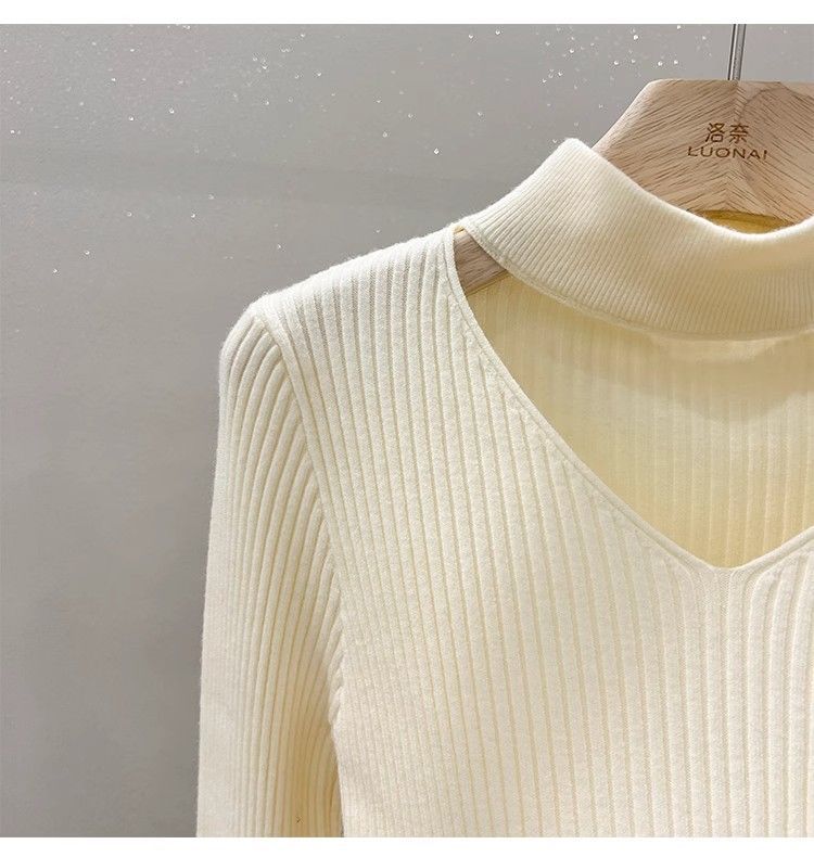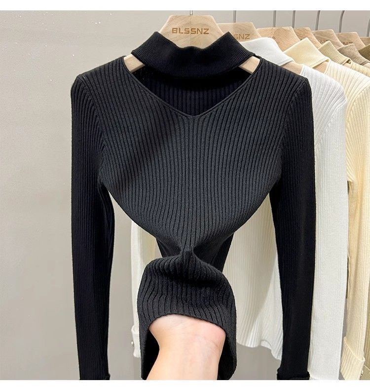 半高襟ニットの底のシャツの女装秋冬2025の新型の透かし彫りの首のセーターの修身の中で長袖の上着を掛けます。