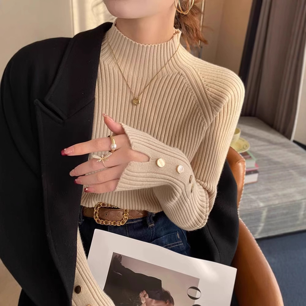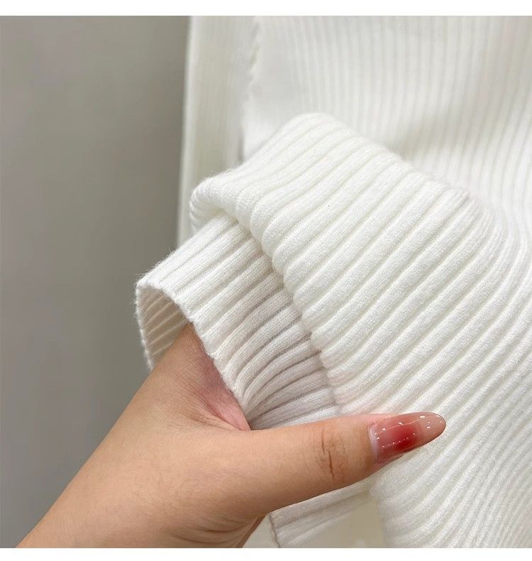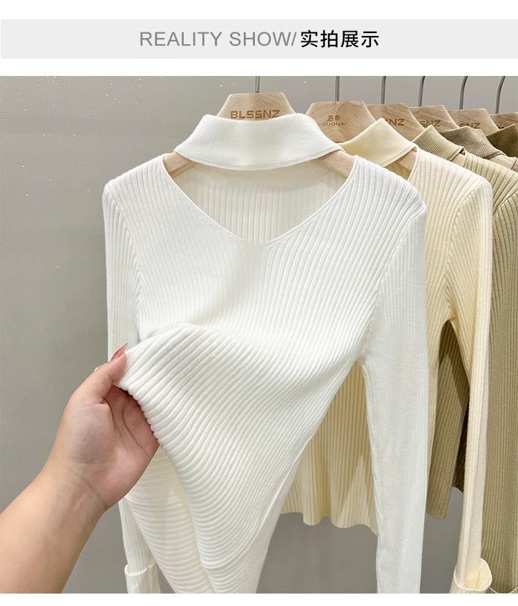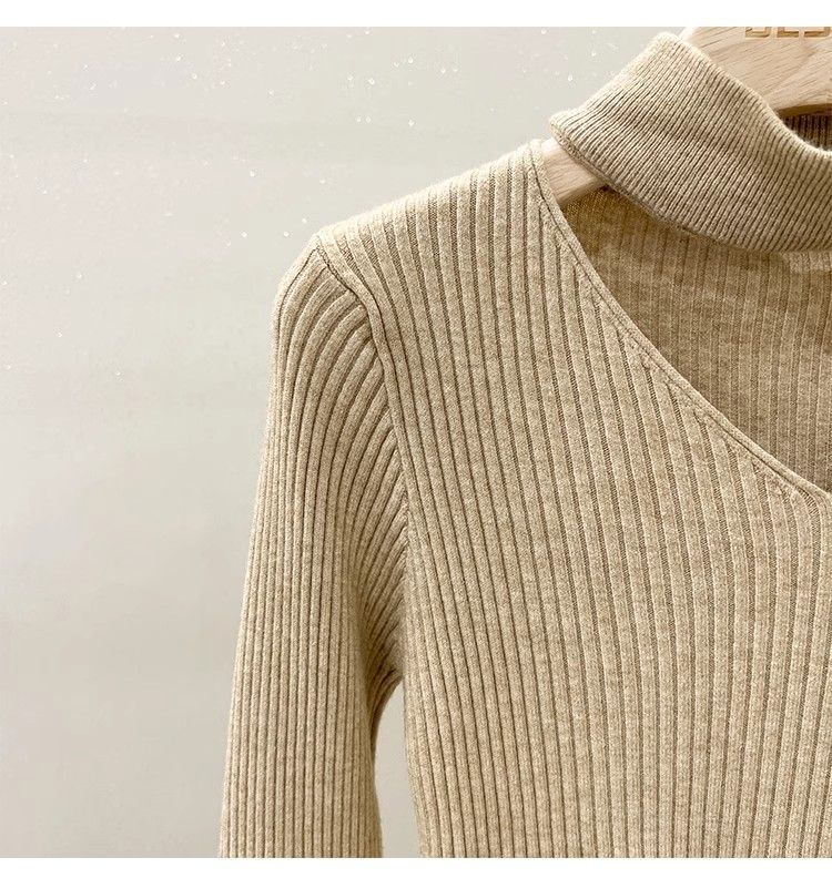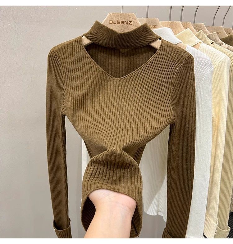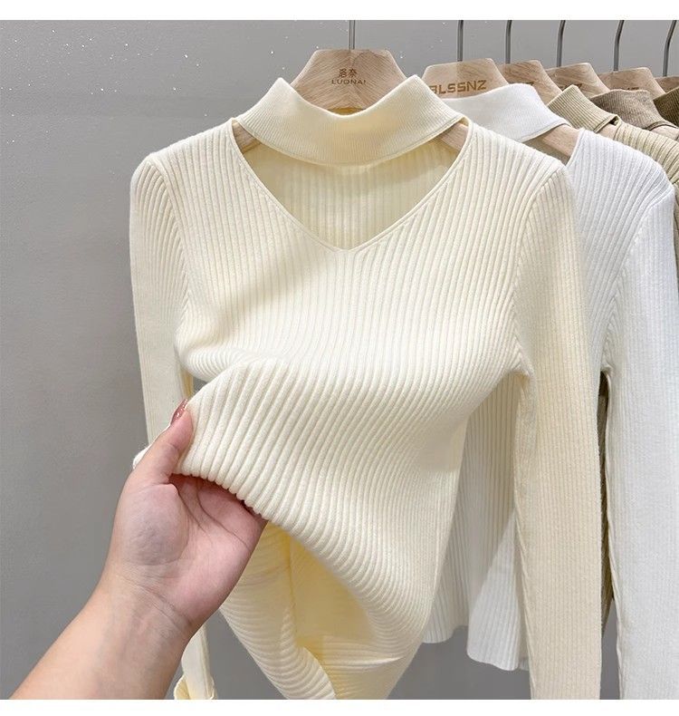 半高襟ニットの底のシャツの女装秋冬2025の新型の透かし彫りの首のセーターの修身の中で長袖の上着を掛けます。