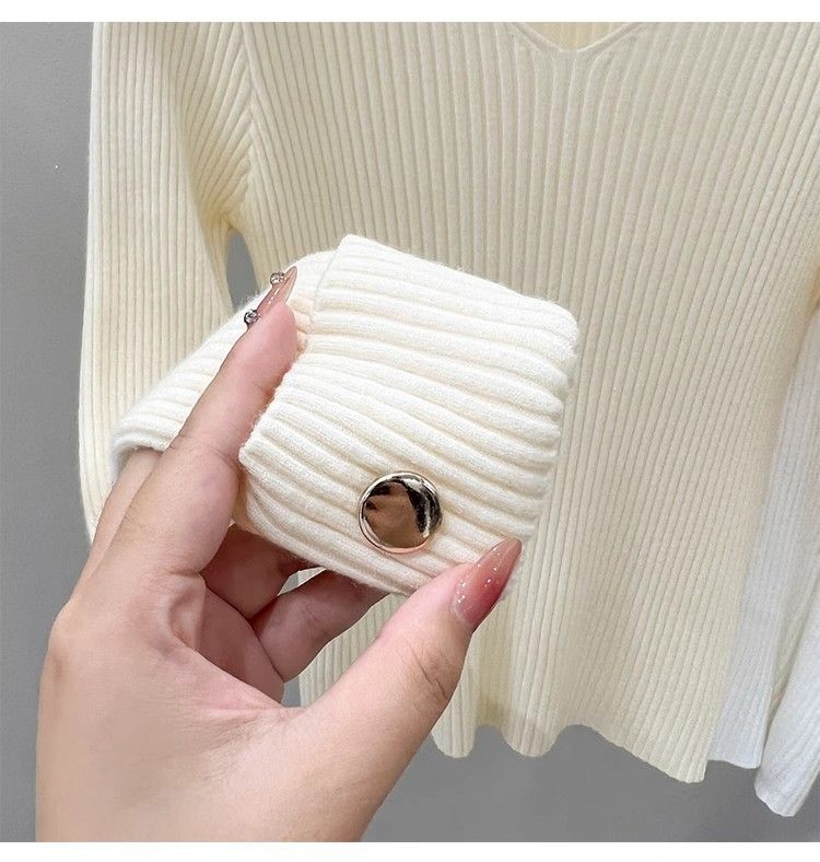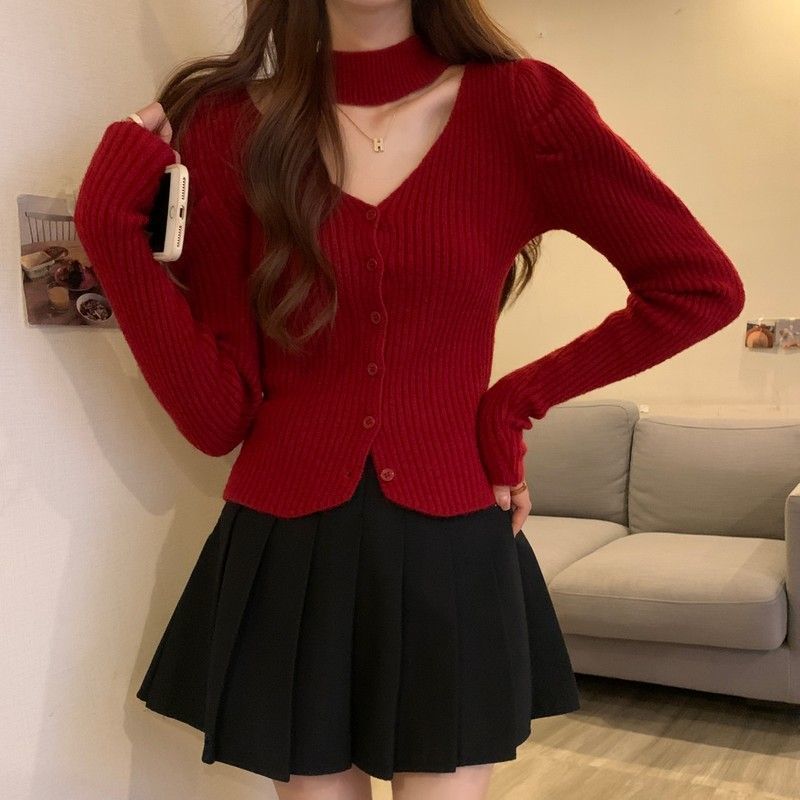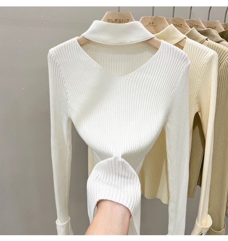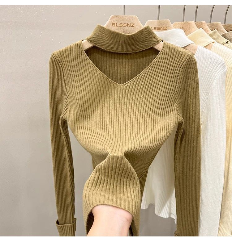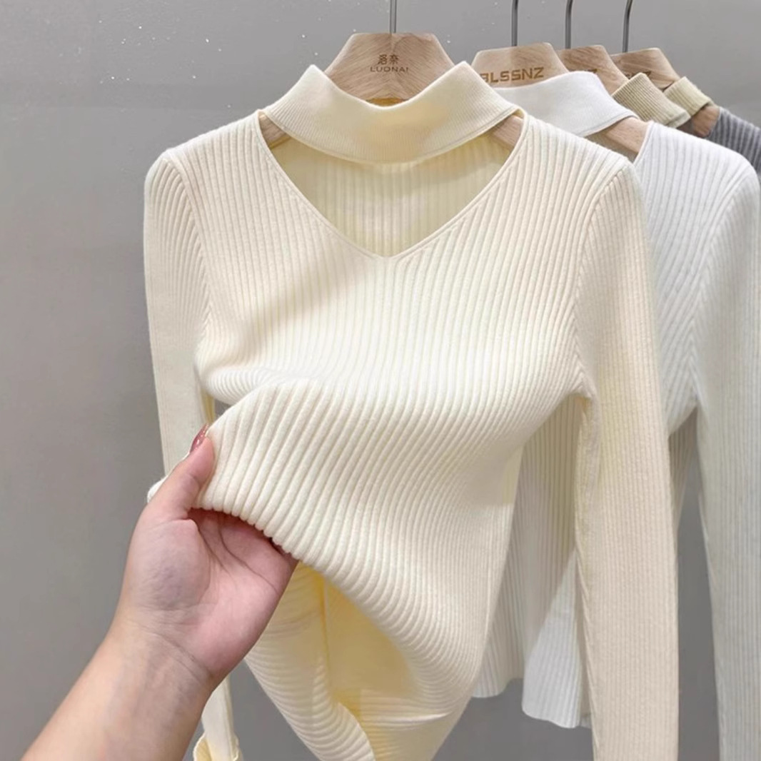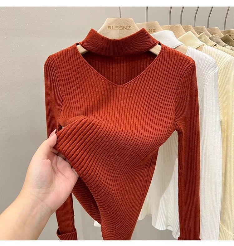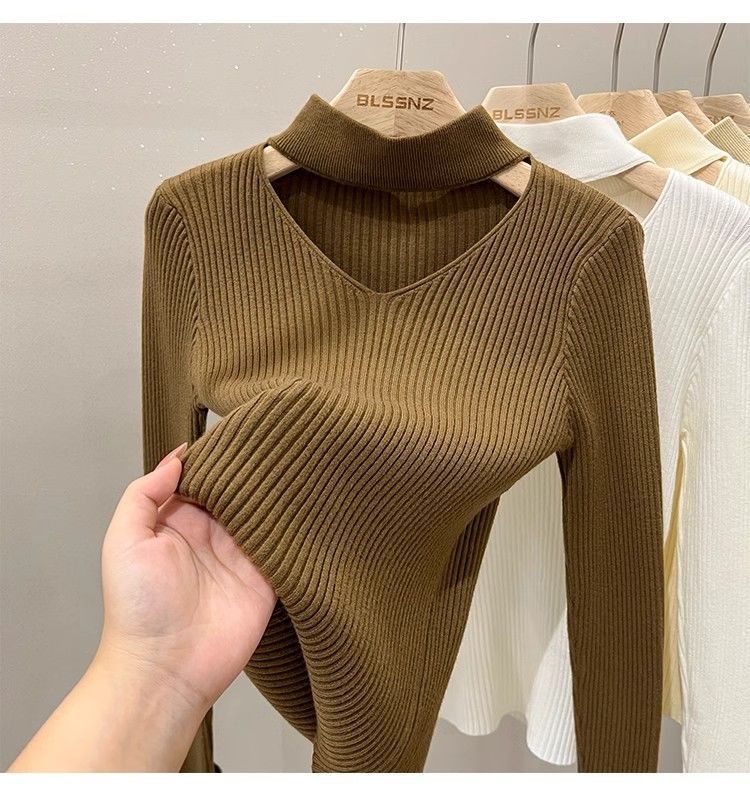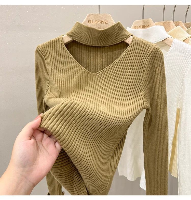 純粋な欲望風スリムフィットインナーセーター女性用52025秋冬新作高級感のあるホルターネックVネック長袖ニットセーター