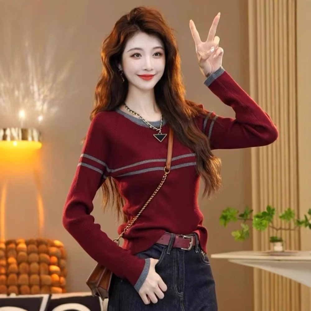 今年はアンゴラの赤い丸首の長袖のストライプの復古の底のシャツが流行します。