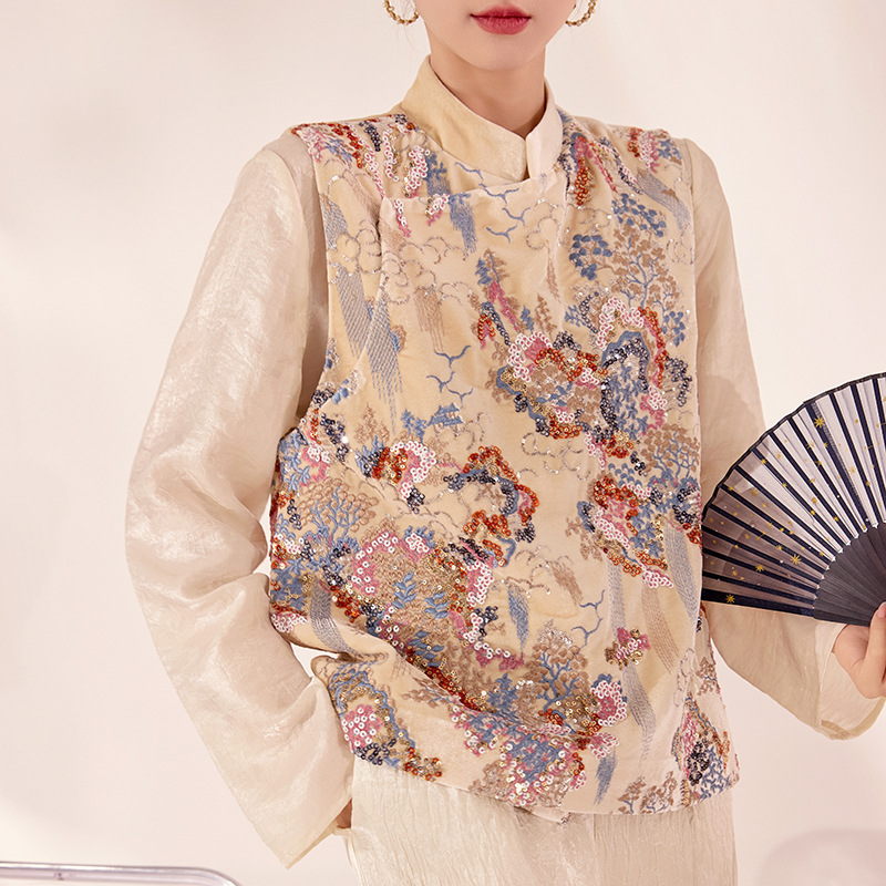 新型レトロ立襟単列ボタン国風ベスト2025夏刺繍デザイン绢糸馬甲N4045