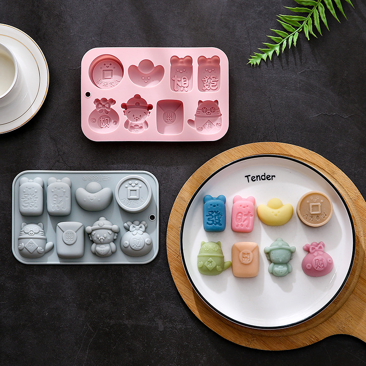 スポット8連8種類の異なる旧正月のテーマ造形シリコン金型焙煎ケーキチョコレート金型滴ゴム金型