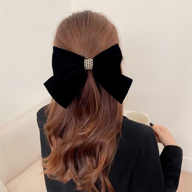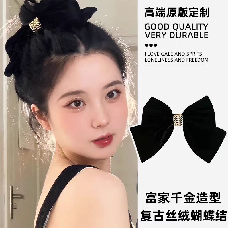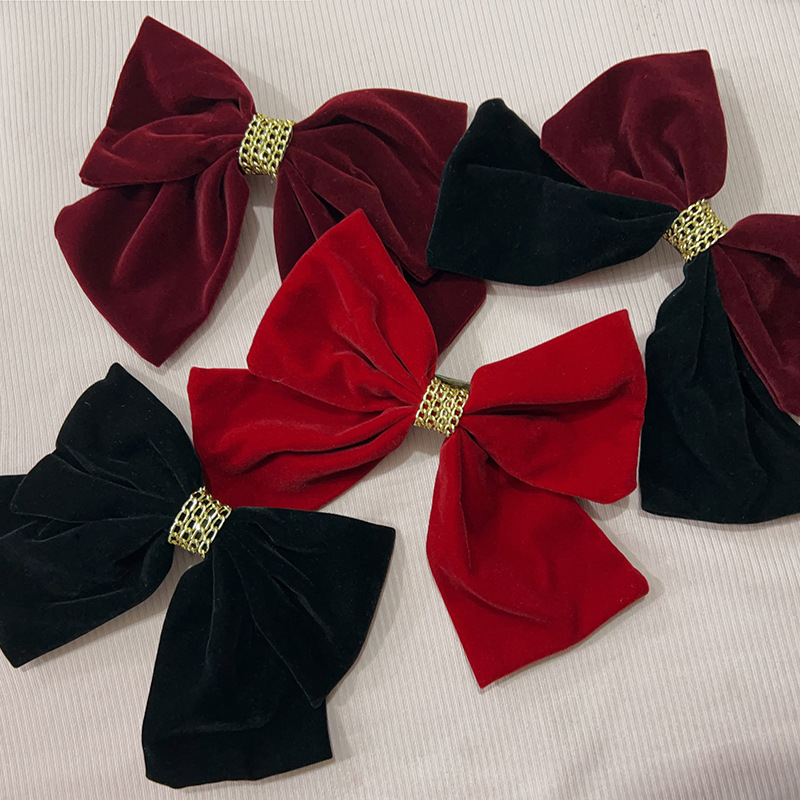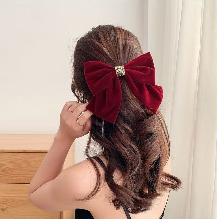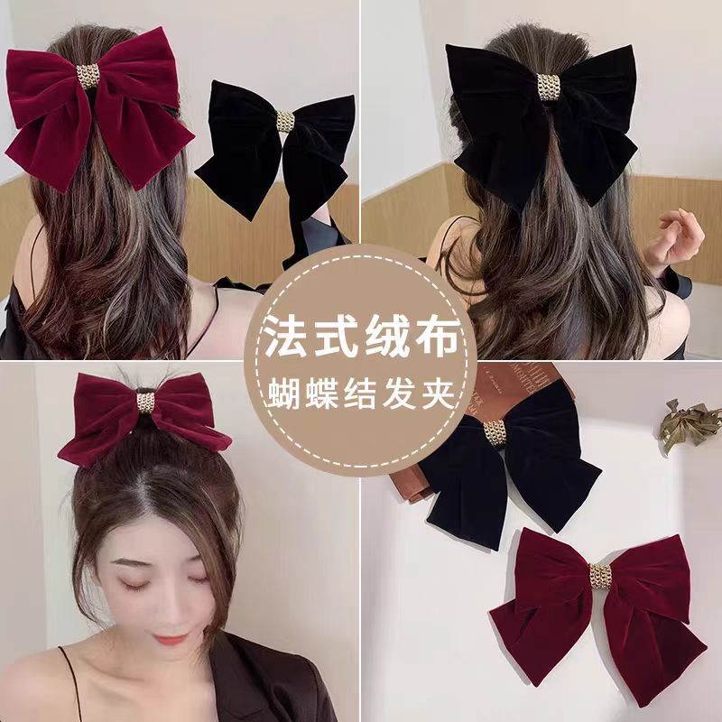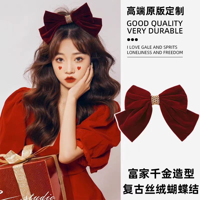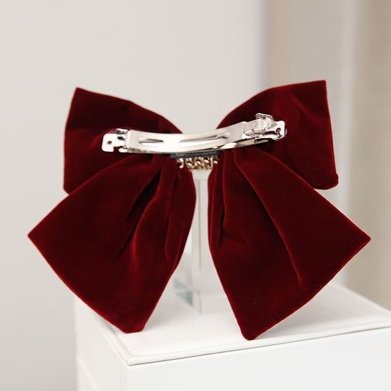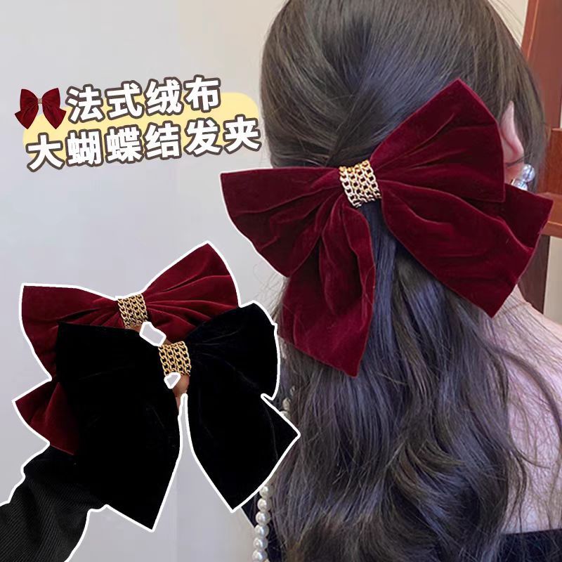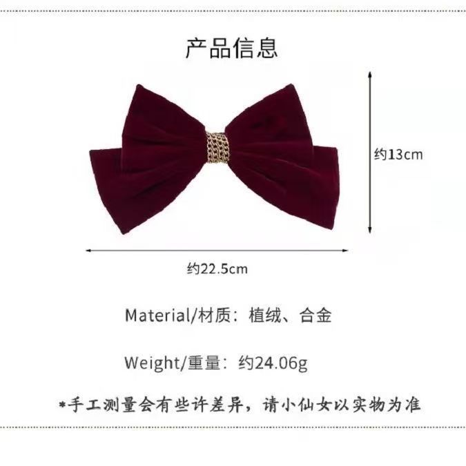 链条丝绒蝴蝶结酒红色弹簧夹女大号后脑勺新年圣诞节发饰发夹顶夹