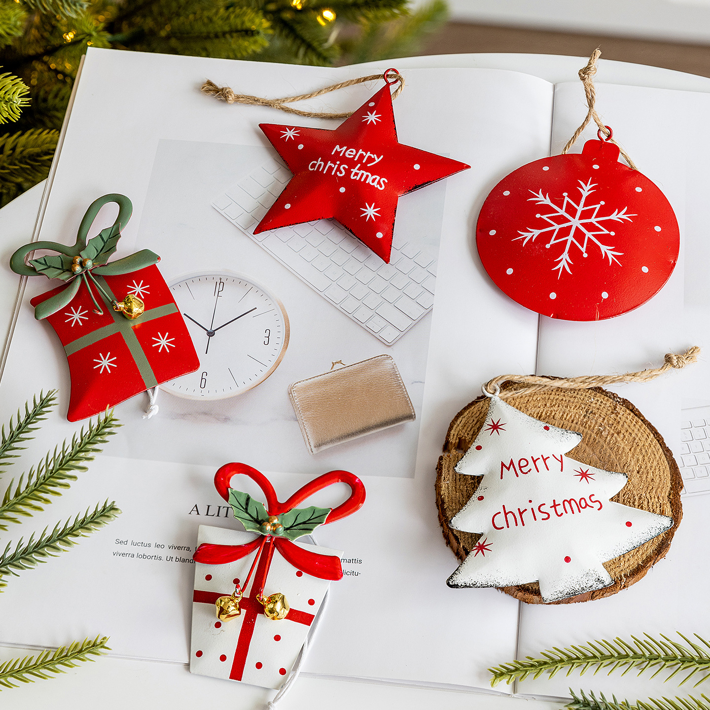 热销圣诞节北欧铁皮五角星装饰挂件红色彩绘礼物盒圣诞树装扮挂饰