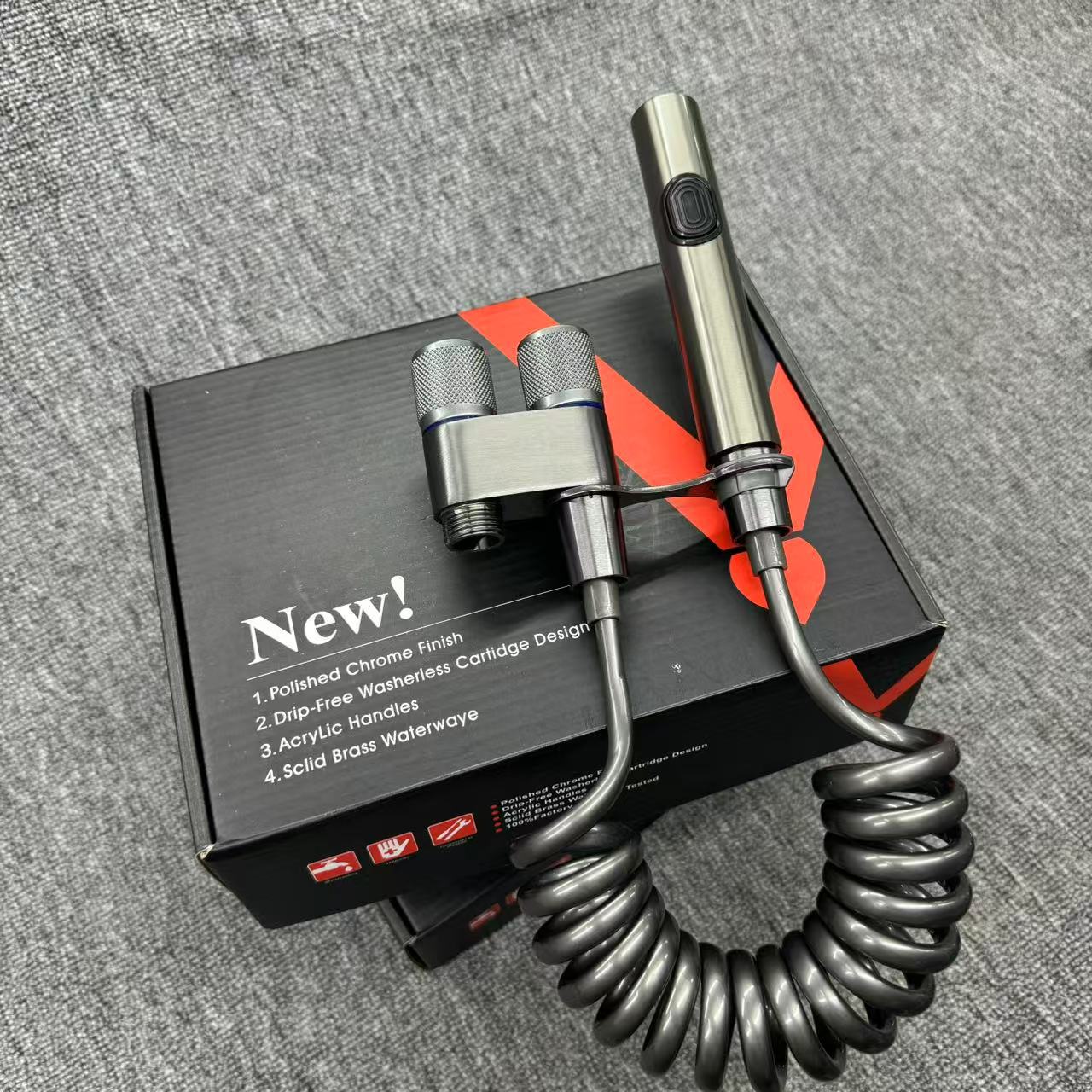 ステンレス製三方角型バルブ水栓、一入口二出口、ダブルスイッチ、二重制御、トイレ用、スプレーガン付き