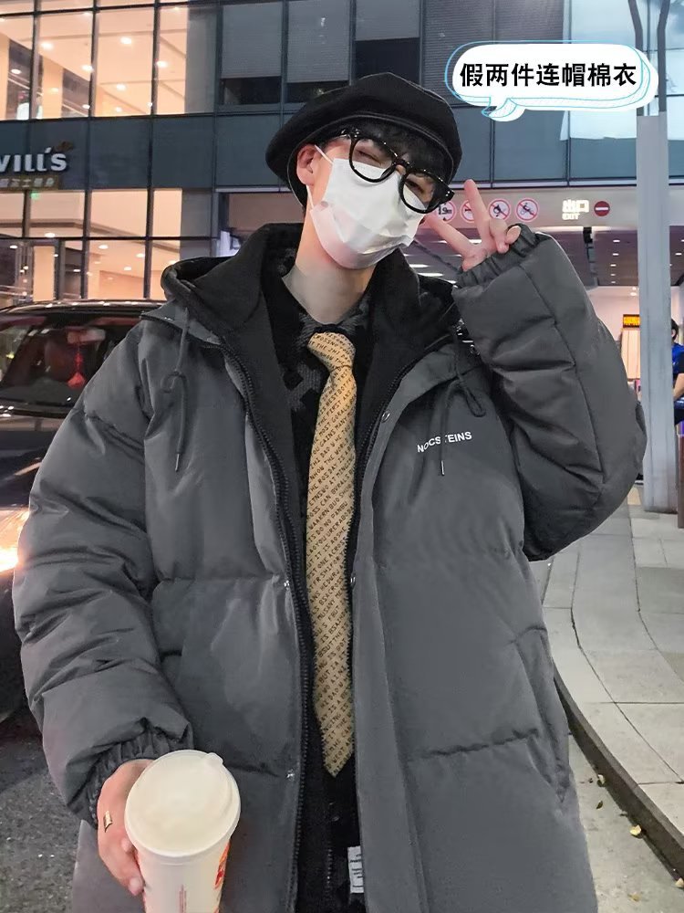 冬季假两件棉衣男外套韩版潮流宽松百搭连帽棉服港风帅气加厚棉袄