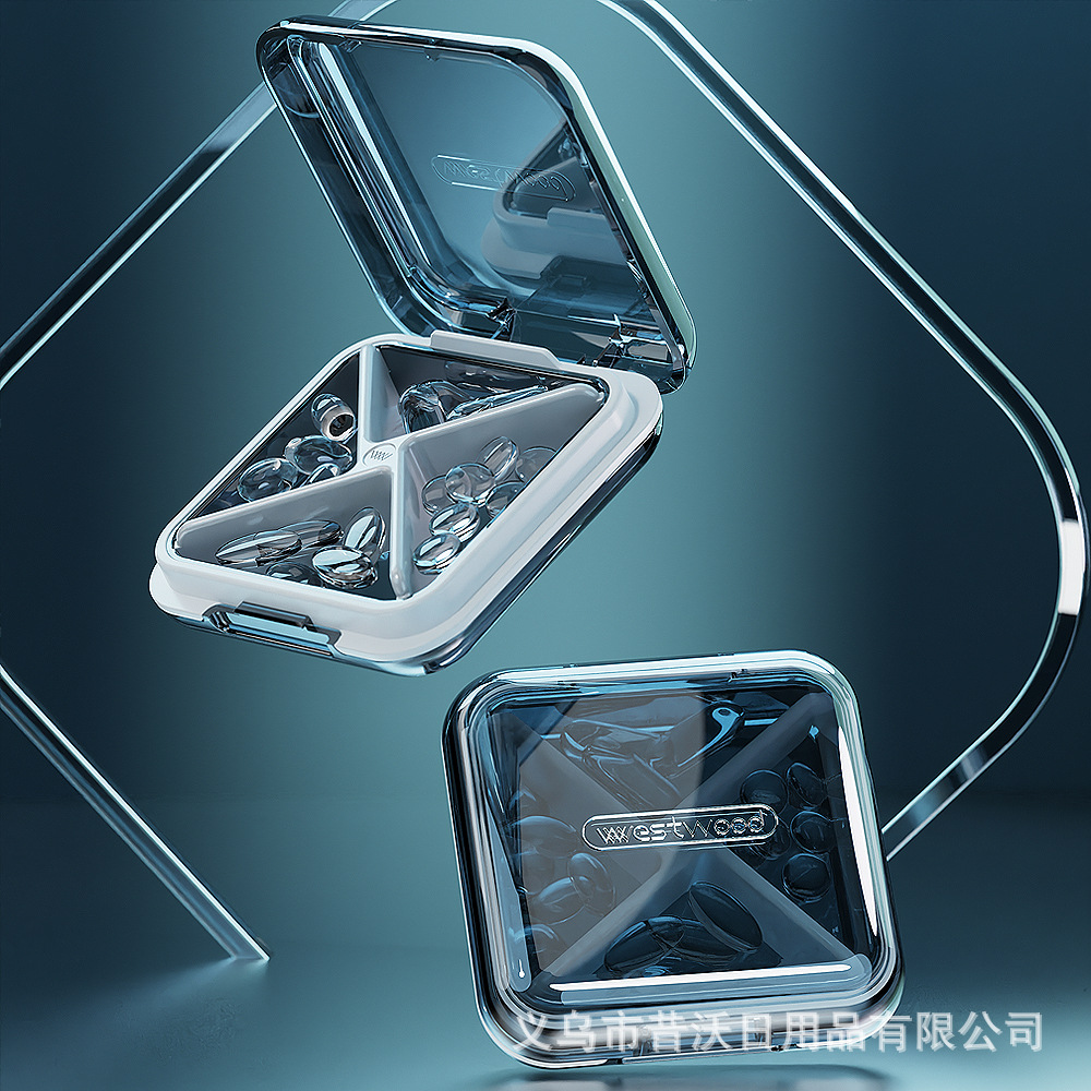日本の規格品の小さい薬の箱の4格は携帯用小さいサイズを分けて持ち歩いてミニの7日間の薬の箱の密封の大容量を持ちます。