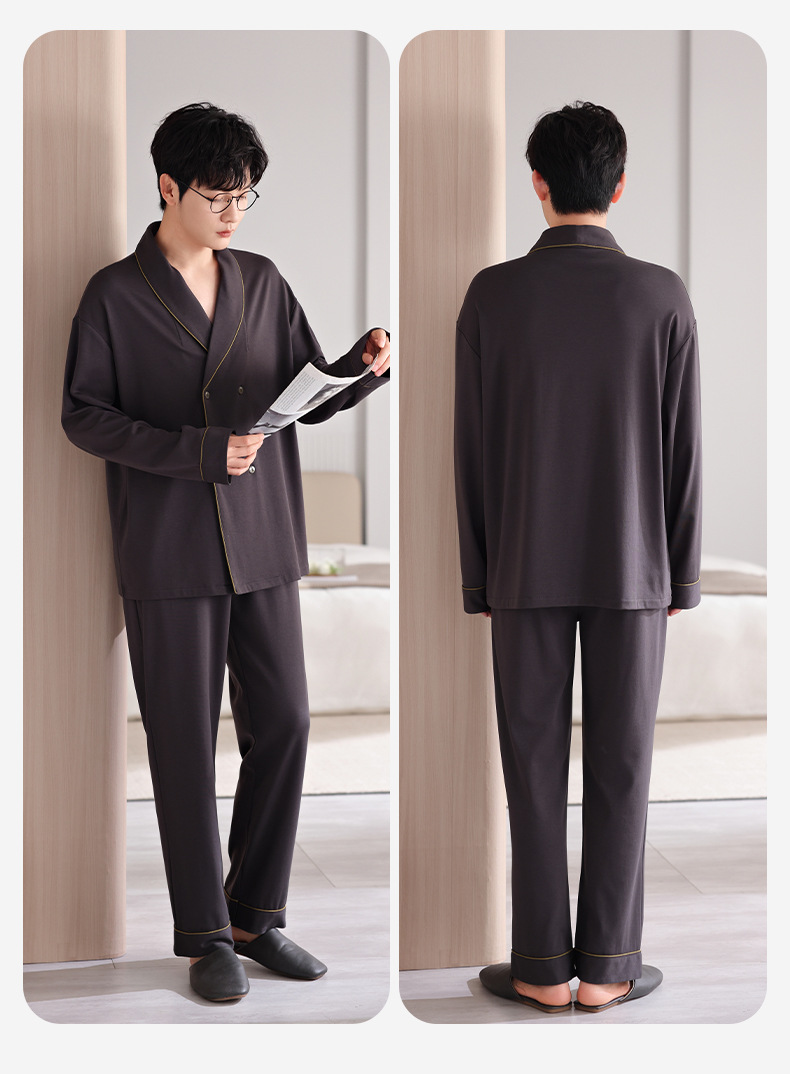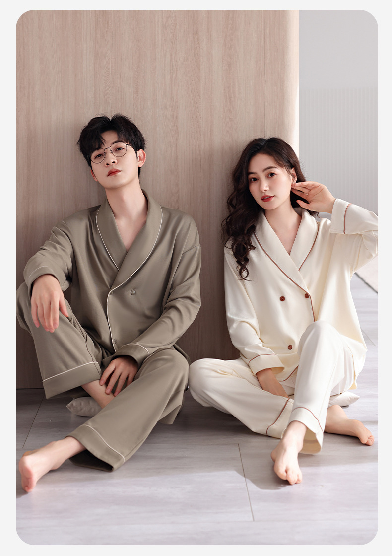 カップルパジャマ女性プルオーバー綿春と秋のバスローブ式長袖長ズボン純色の大きいサイズの純綿家庭服セット男性
