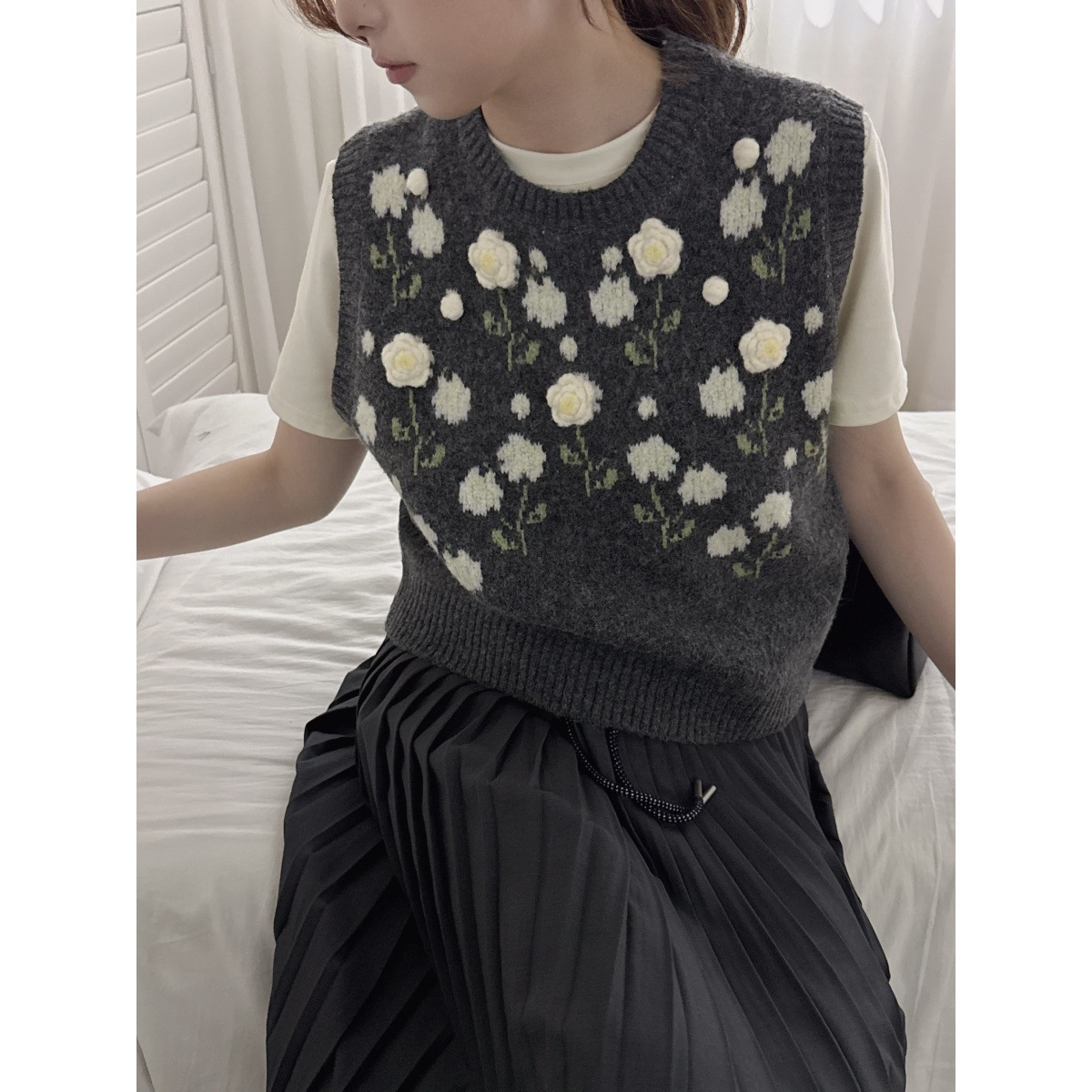 2025年秋冬季新款针织套头背心圆领温柔立体花朵刺绣针织马甲上衣