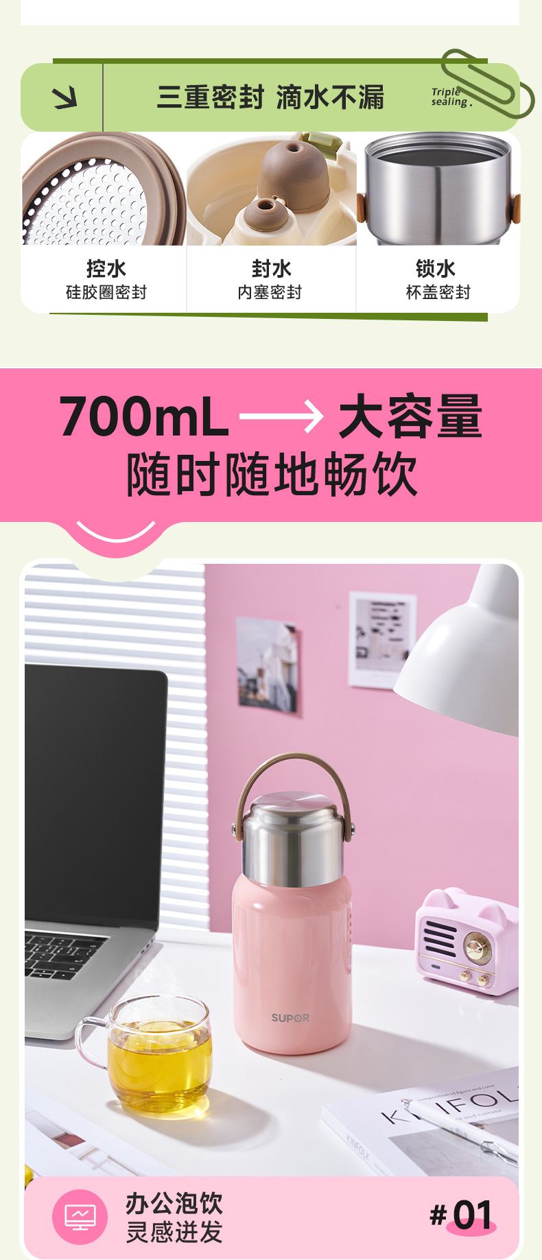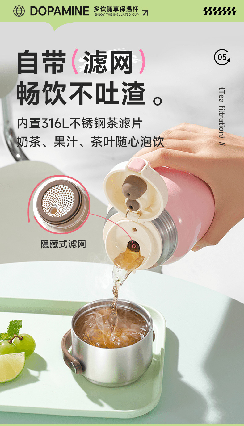 苏泊尔保温杯316大容量户外女学生高颜值锈钢水杯泡茶水分离杯子