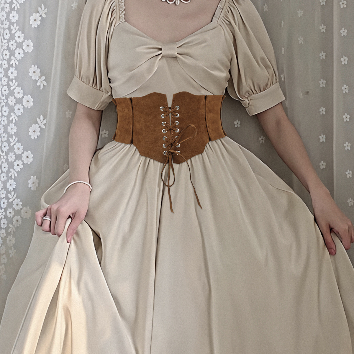 クロスボーダーレトロ宮殿スタイルの女性用ウエストバンド、レースアップスエード装飾ワイドベルト、女性用多用途ドレス