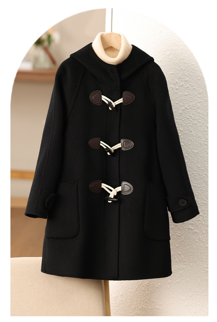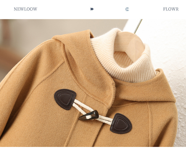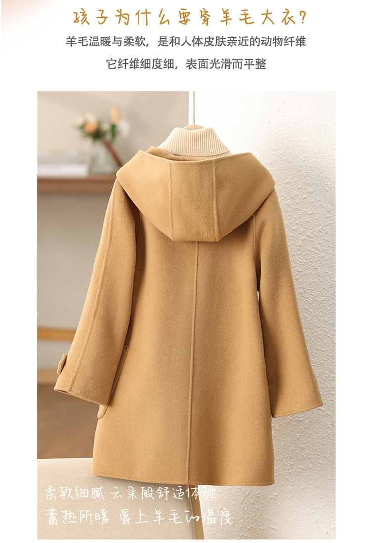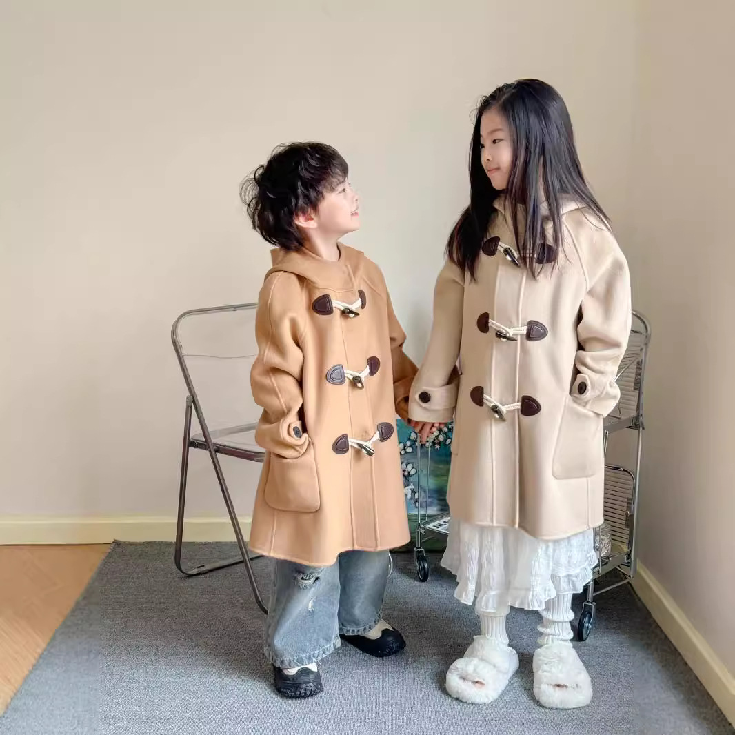 新しい韓国風子供用両面ホーンボタンウールコート、男の子と女の子用のミドル丈のフード付きコート