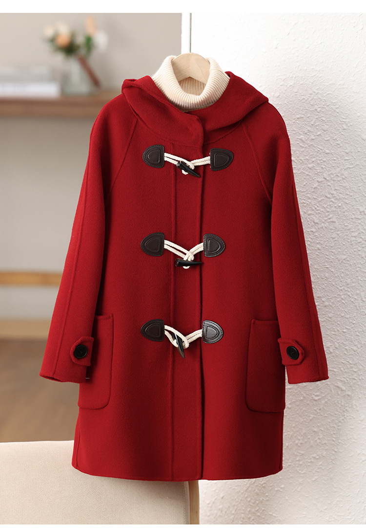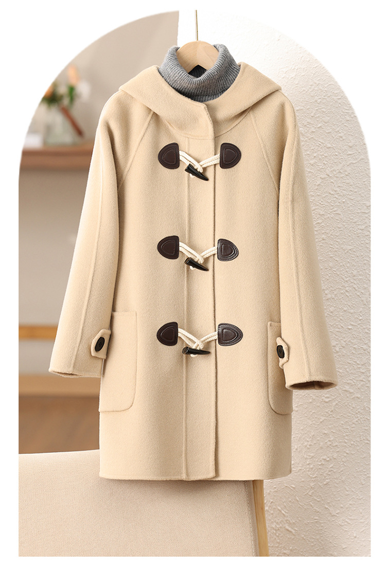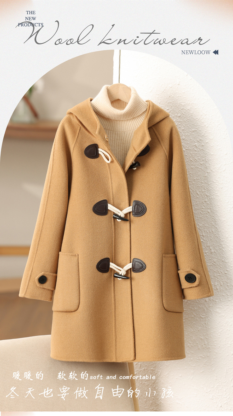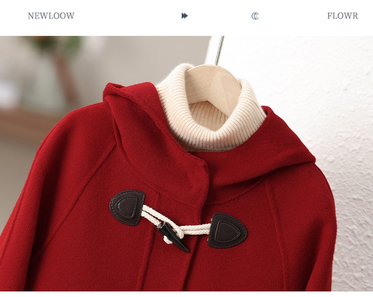新しい韓国風子供用両面ホーンボタンウールコート、男の子と女の子用のミドル丈のフード付きコート