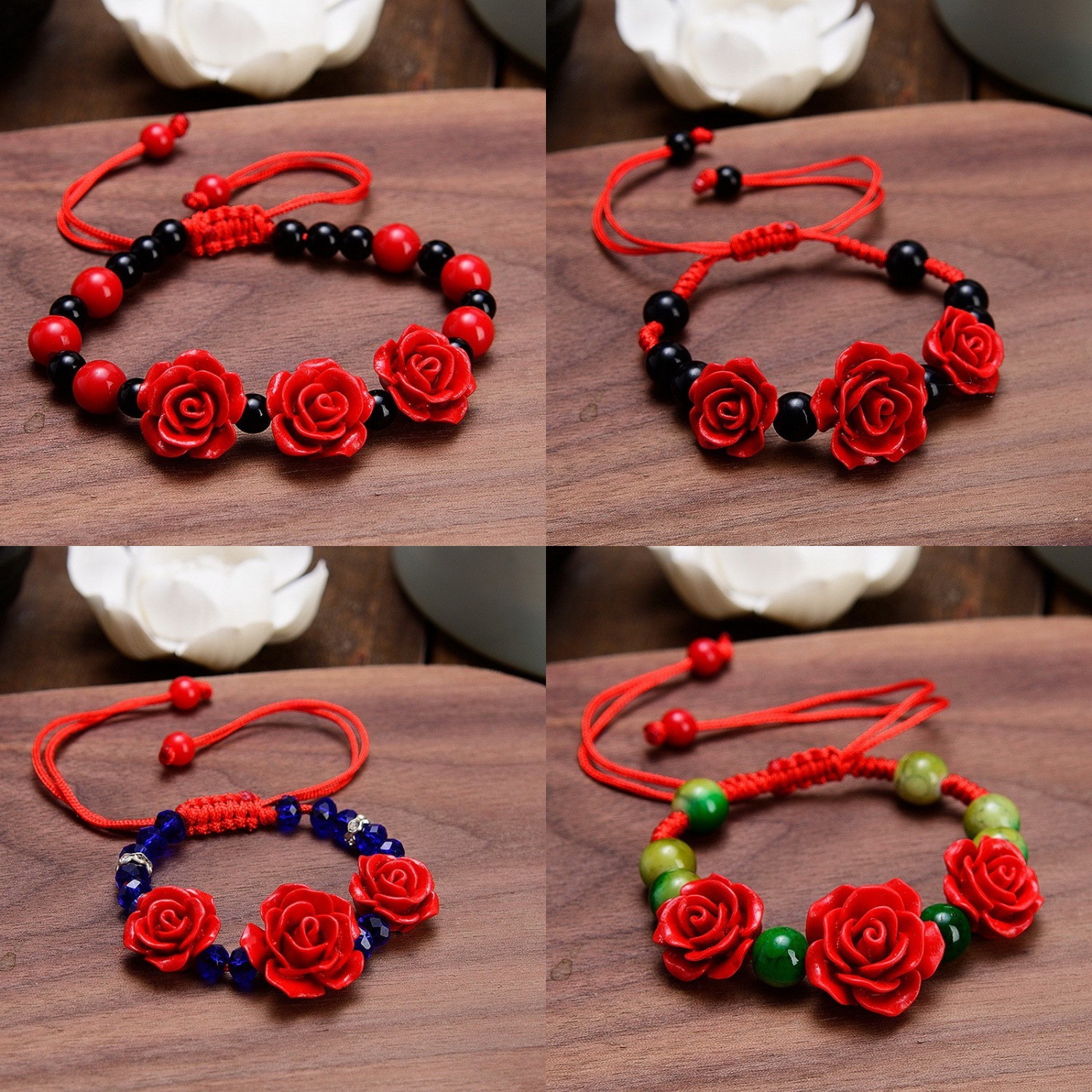新しい赤いバラのブレスレット民族風の花のビーズのブレスレットは女性の赤いひもの花のブレスレットを調節することができます。