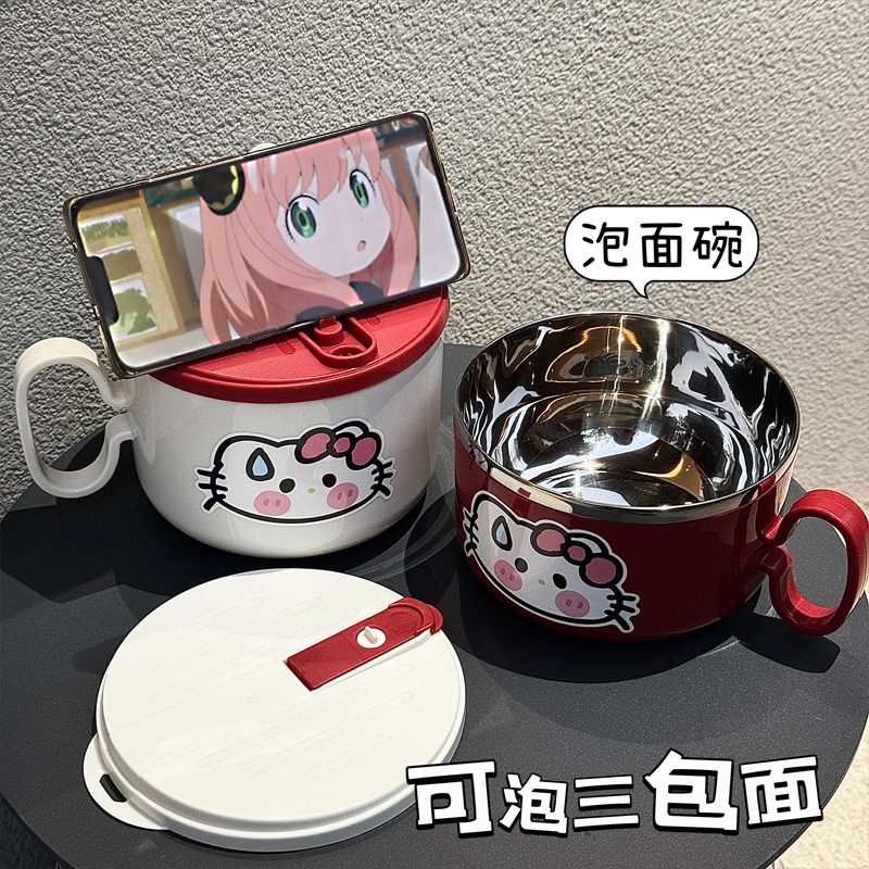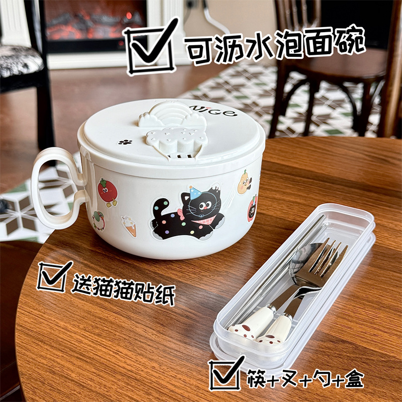 無言猫泡麺ボウル304ステンレス大容量水切りカバー付きかわいいins風学生女子食堂弁当箱