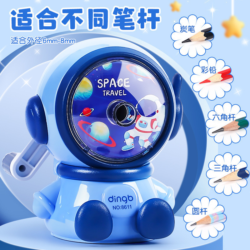宇宙飛行士の小学生の鉛筆削り手が筆削りをしています。