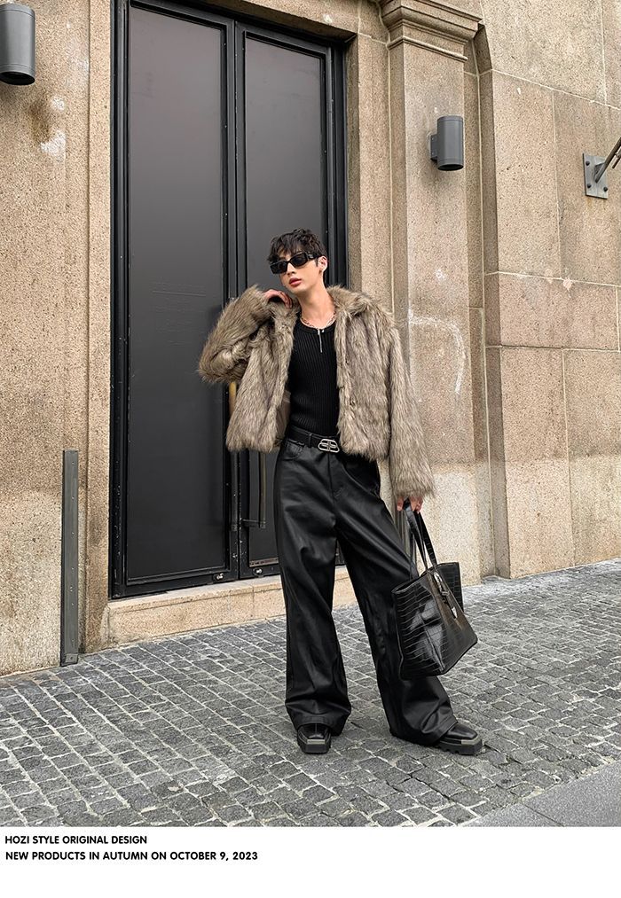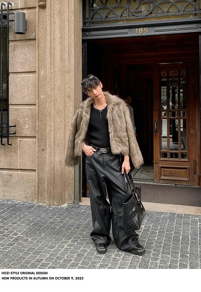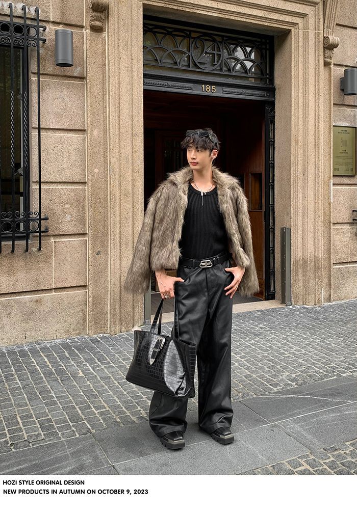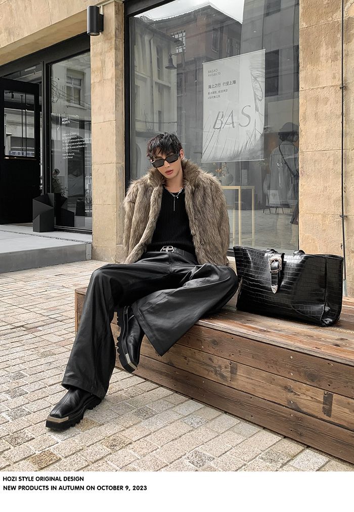2024冬の高級感ファッションpu皮衣コート男痞帅毛皮一体模造皮草座山彫刻コート潮