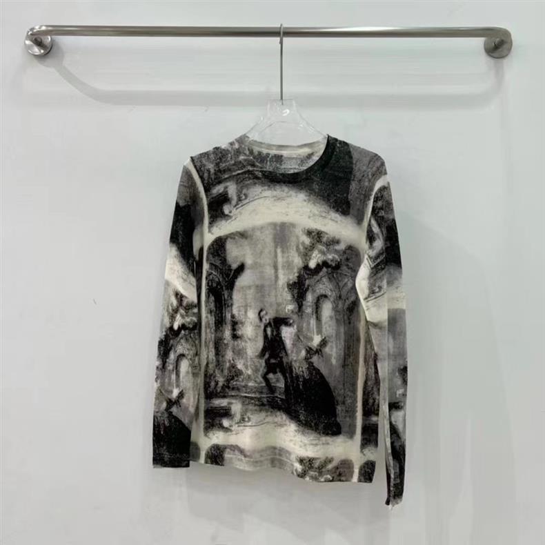 水墨画プリントのおしゃれな水溶性ウールトップス、肌に優しいニットインナー、女性用パイル襟薄手セーター、ベースレイヤー