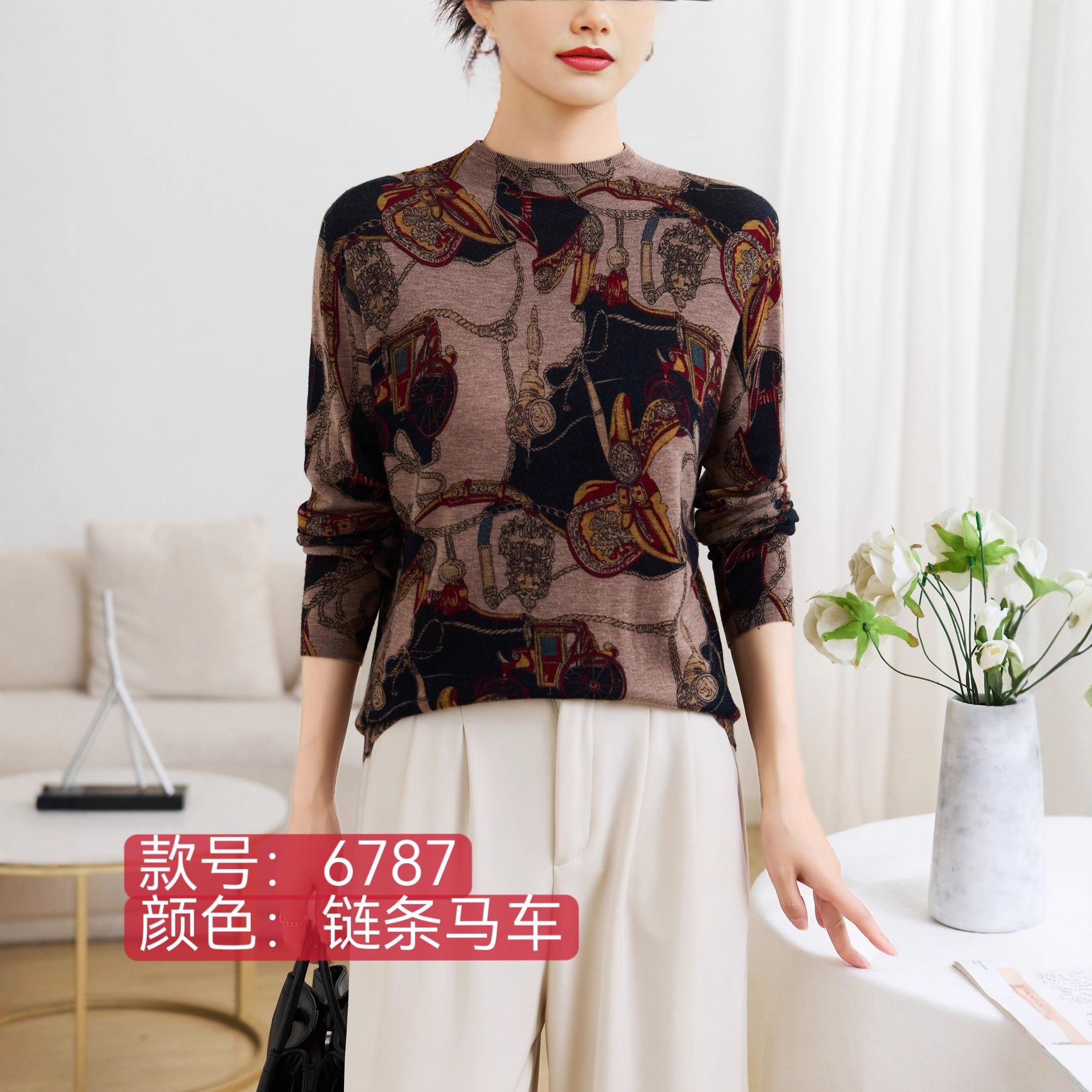 秋冬季2025新款水溶羊毛衫半高领长袖套头印花上衣女士打底杉女装