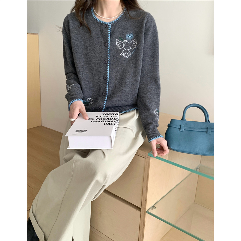 小鸽子刺绣~O~撞色包边针织开衫复古灰小众设计感慵懒风~秋