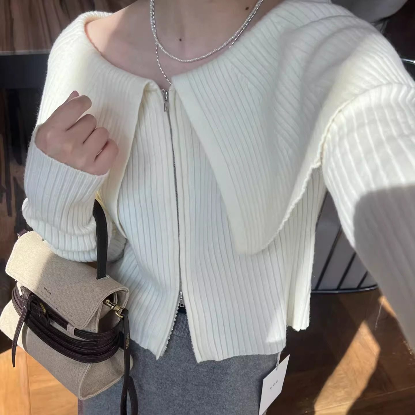 气质一字领披肩双拉链设计百搭显瘦针织开衫女小个子