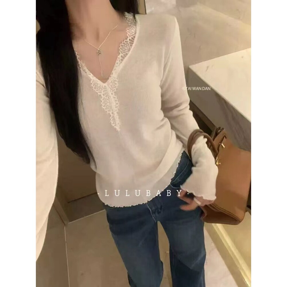 温柔的你~B~睫毛蕾丝拼接V领长袖针织衫细羊毛柔软修身打底衫秋冬
