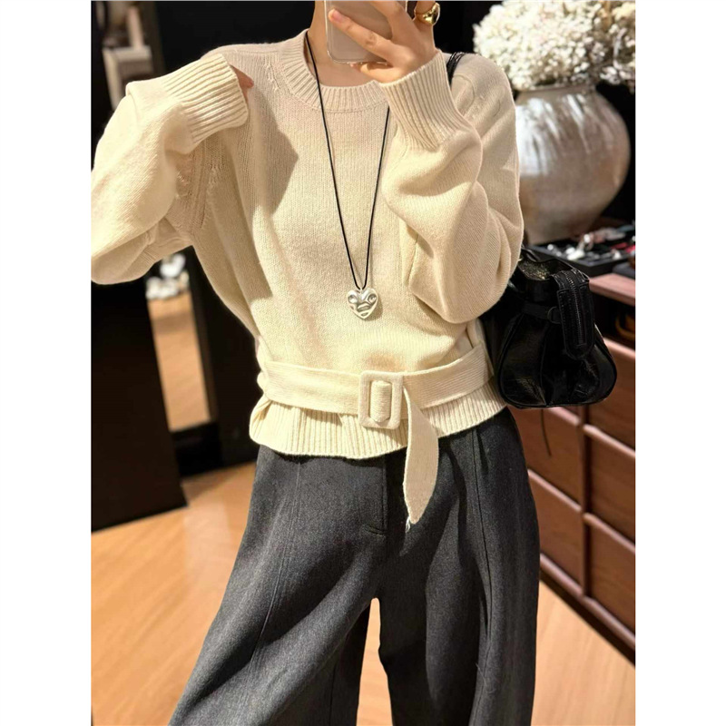 设计感圆领腰带100%绵羊毛套头毛衣女2025秋冬新款百搭软糯针织衫