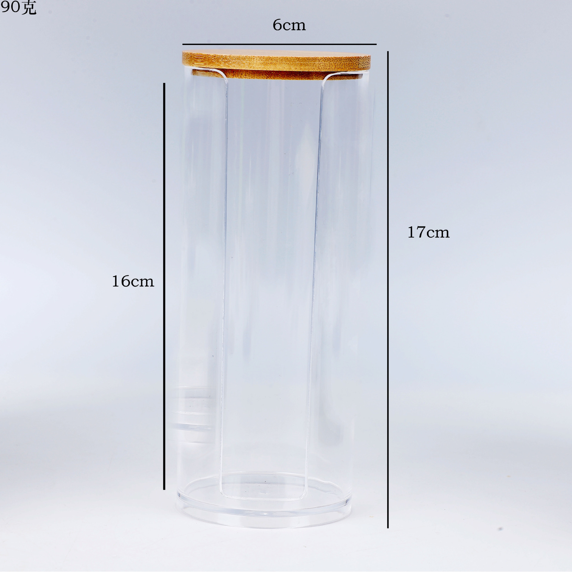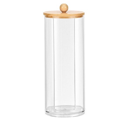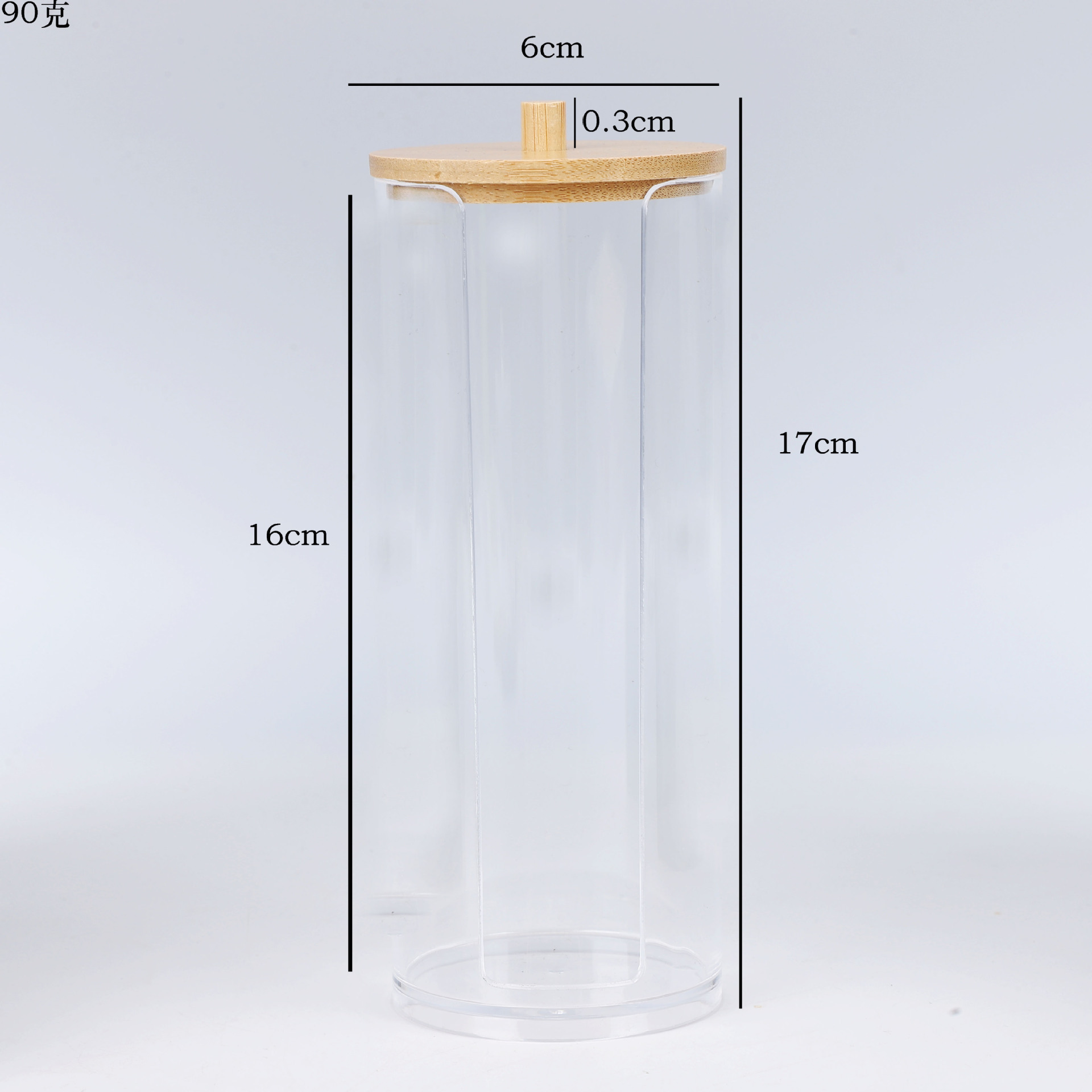 竹の蓋の綿棒の箱のアクリルは丸いコップの収納箱の高い透明な木の蓋の円形の綿棒の箱のドリルの紋様の包装を重ねることができます。