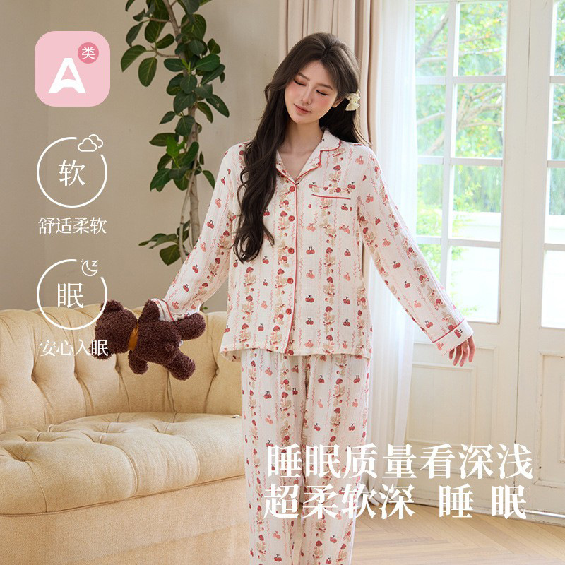 純綿二重ガーゼパジャマレディース新型森系さくらんぼ春秋長袖綿100% ゆったりホームウェアセット