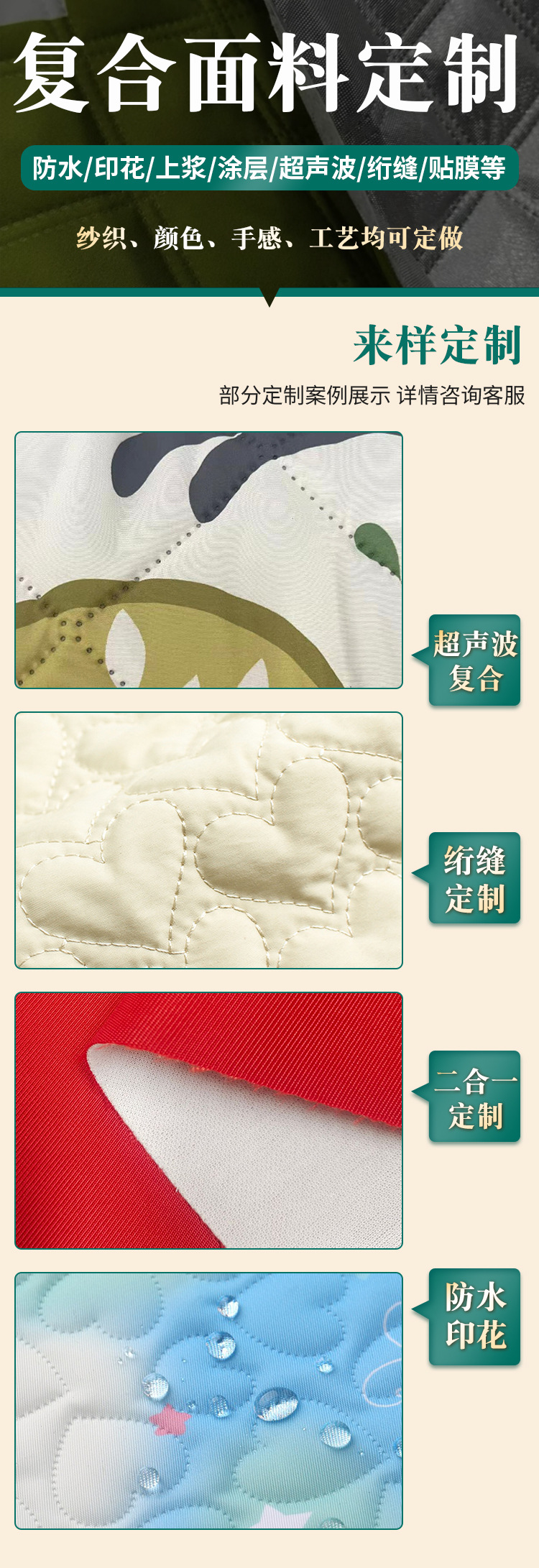 ポリエステルタフタ、起毛ピーチスキン、四方向ストレッチ、防水プリント、超音波複合キルティングスリーインワン