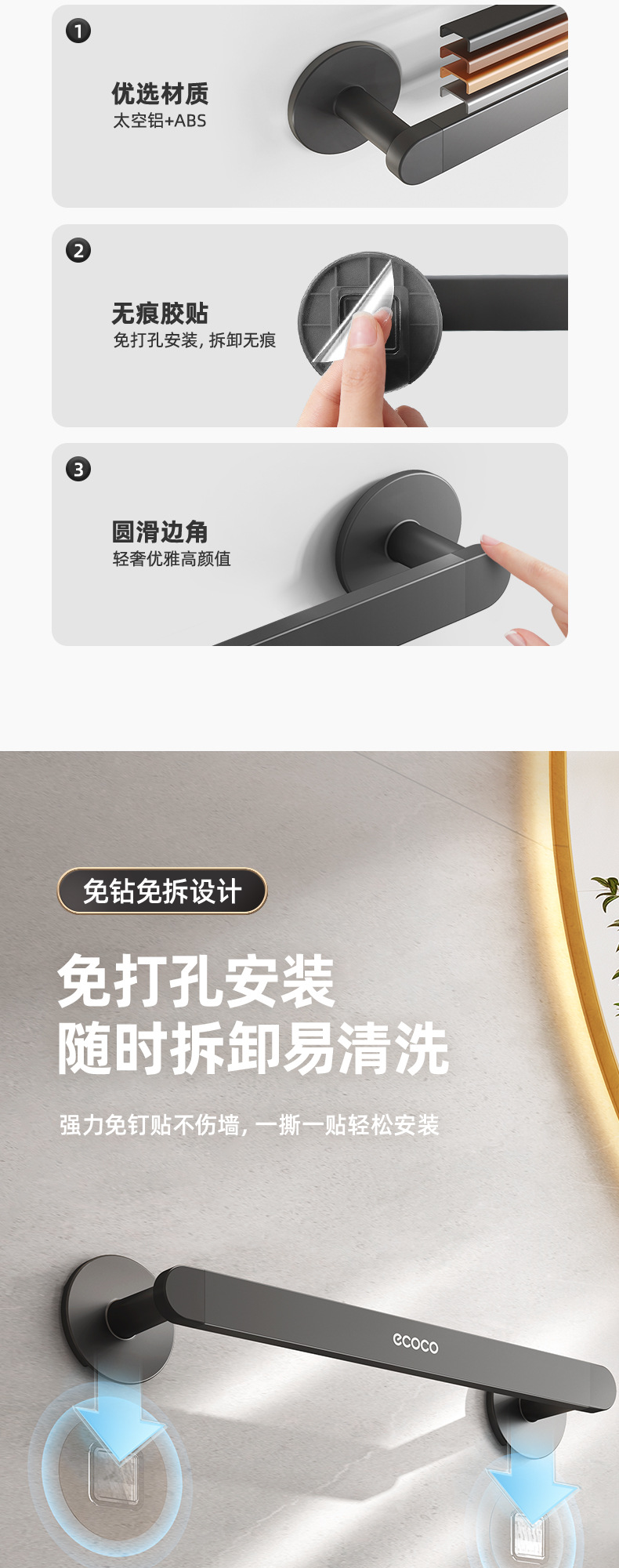 タオル掛け 穴あけ不要 浴室用ハンガー バスルームタオルラック 北欧風 シンプル クリエイティブ シングルポール収納バー