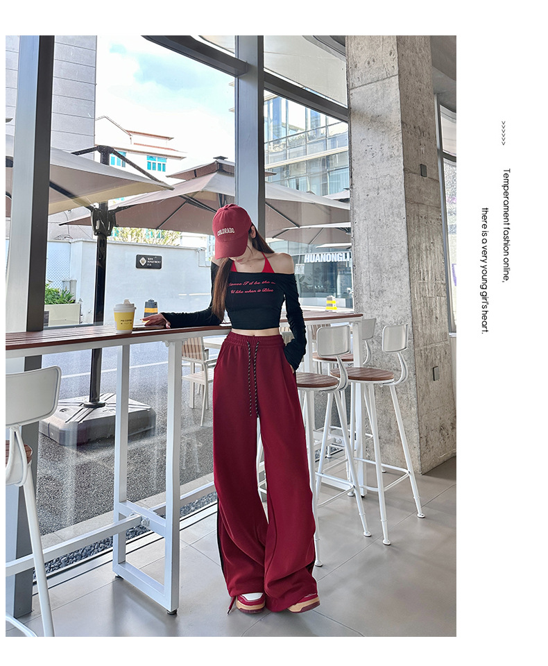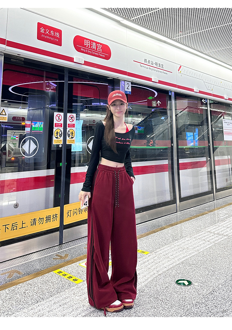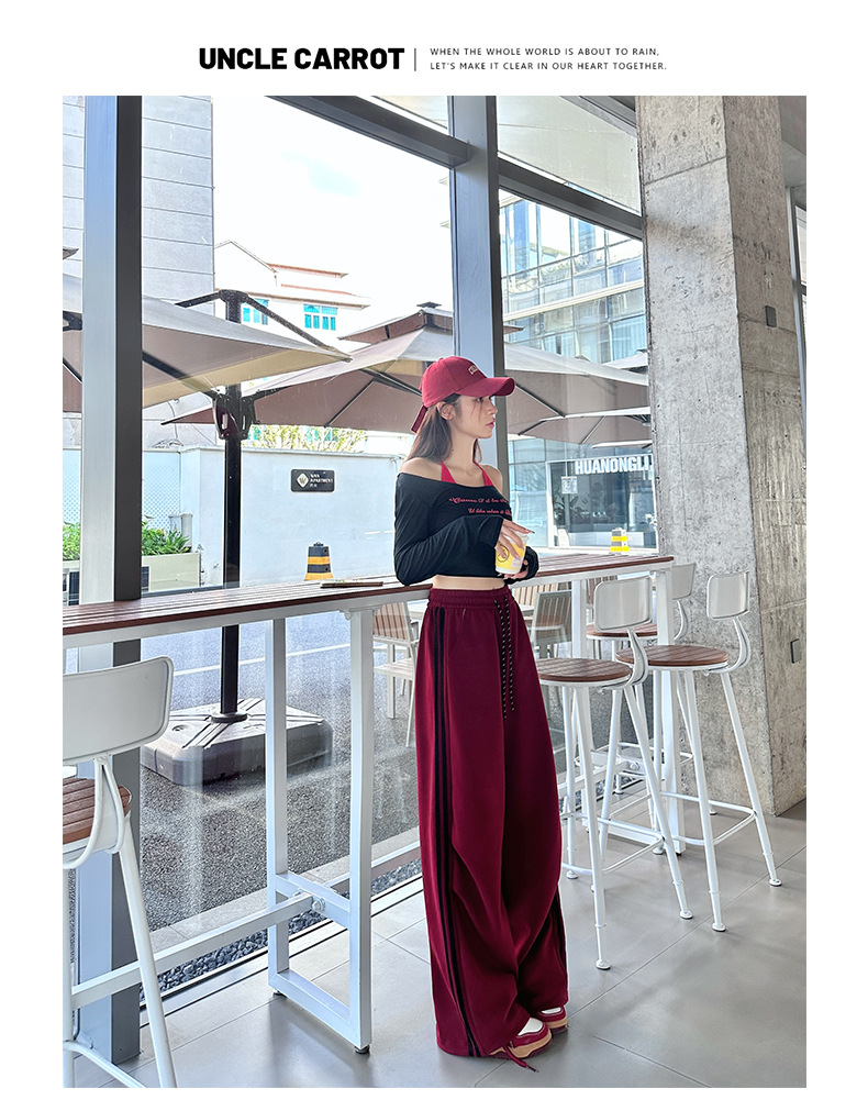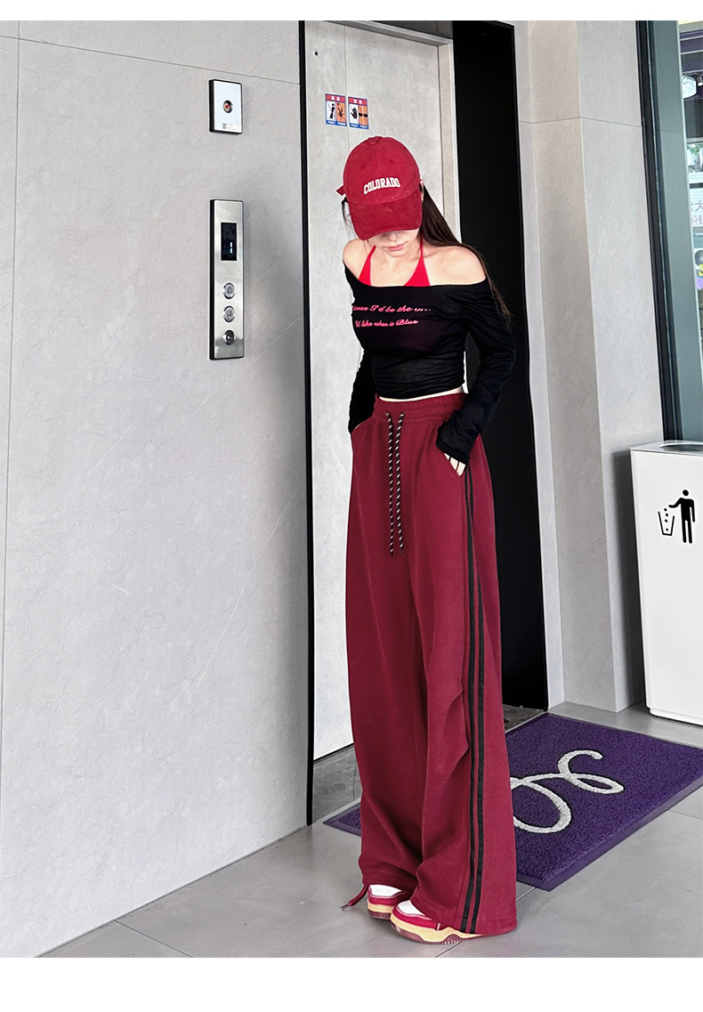アメリカ風速乾ワイドパンツ レディース 2026春新作 ハイウエスト ゆったり カジュアルパンツ ドレープ感 レッド カジュアルスポーツパンツ