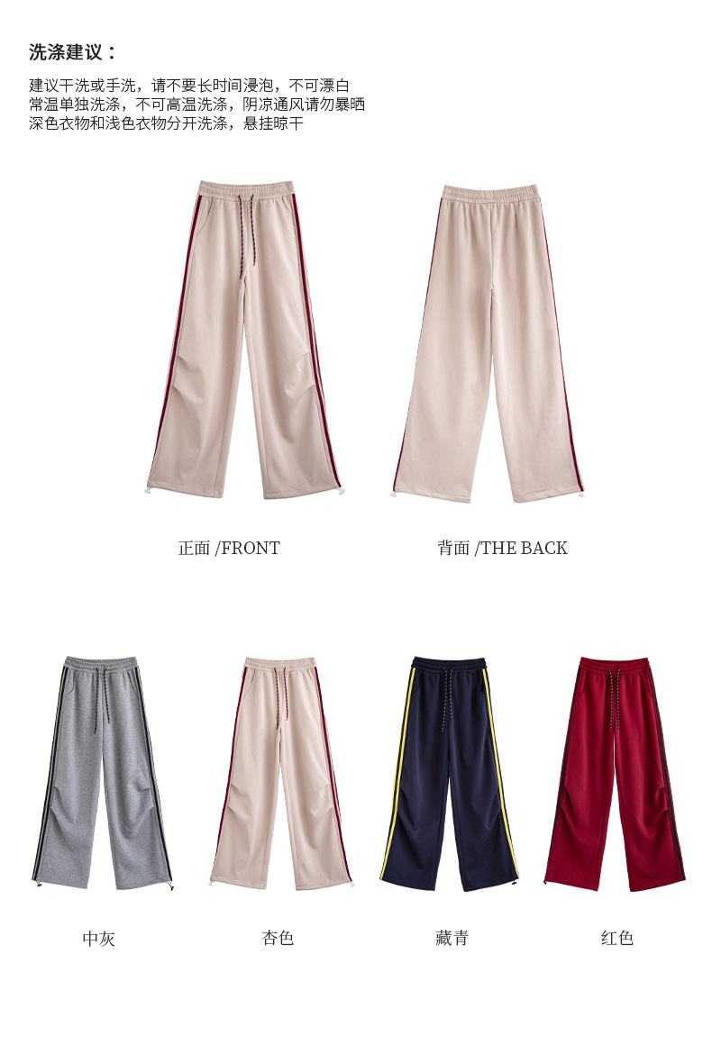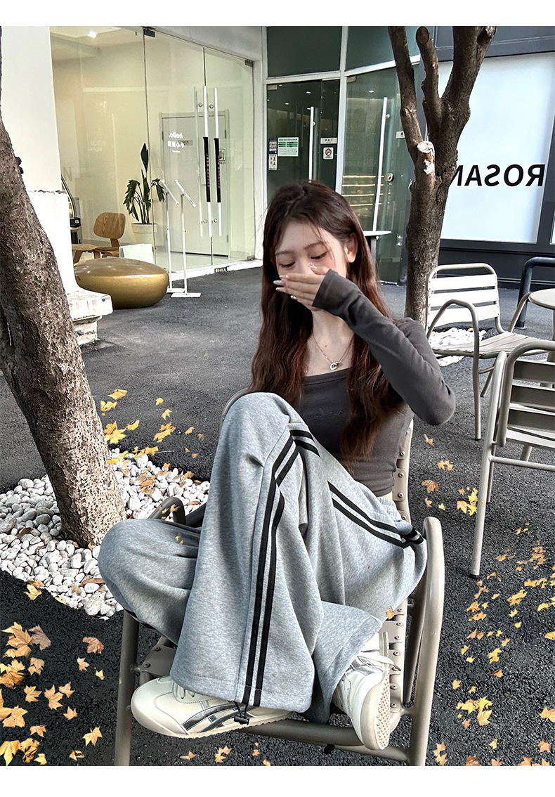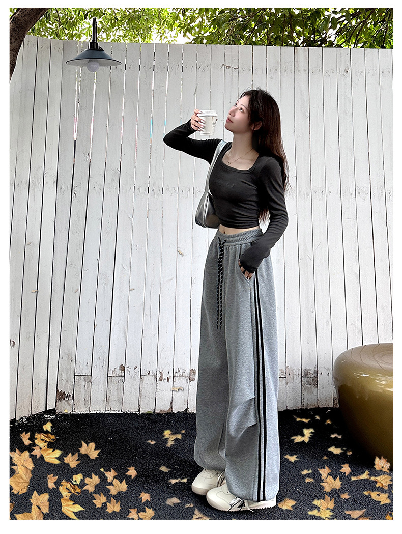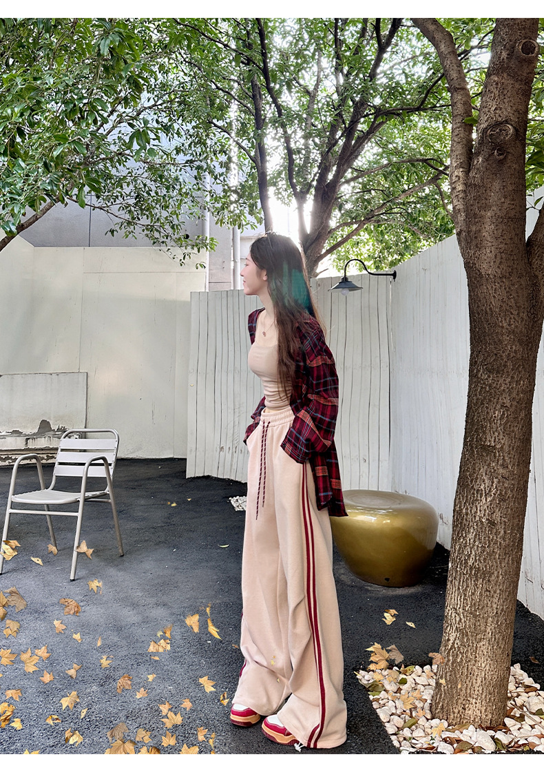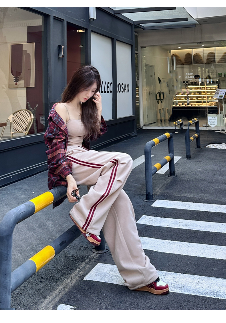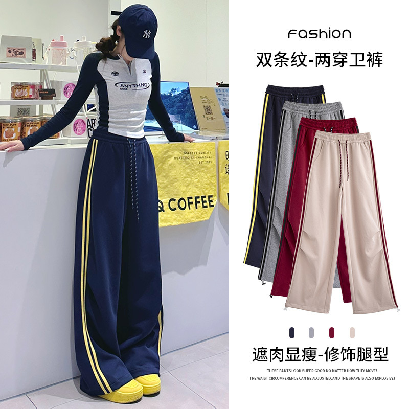 2025年秋新作デザイン、ダブルストライプのアメリカンハイストリートスタイルのレディーススポーツパンツ、ドローストリング付きの裾が絞れるカジュアルスウェットパンツ