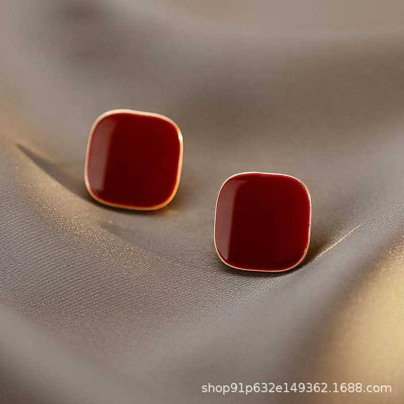 S925銀針イヤリング高品質レトロ赤い四角いピアス韓国高級感小衆百合耳飾り卸売り