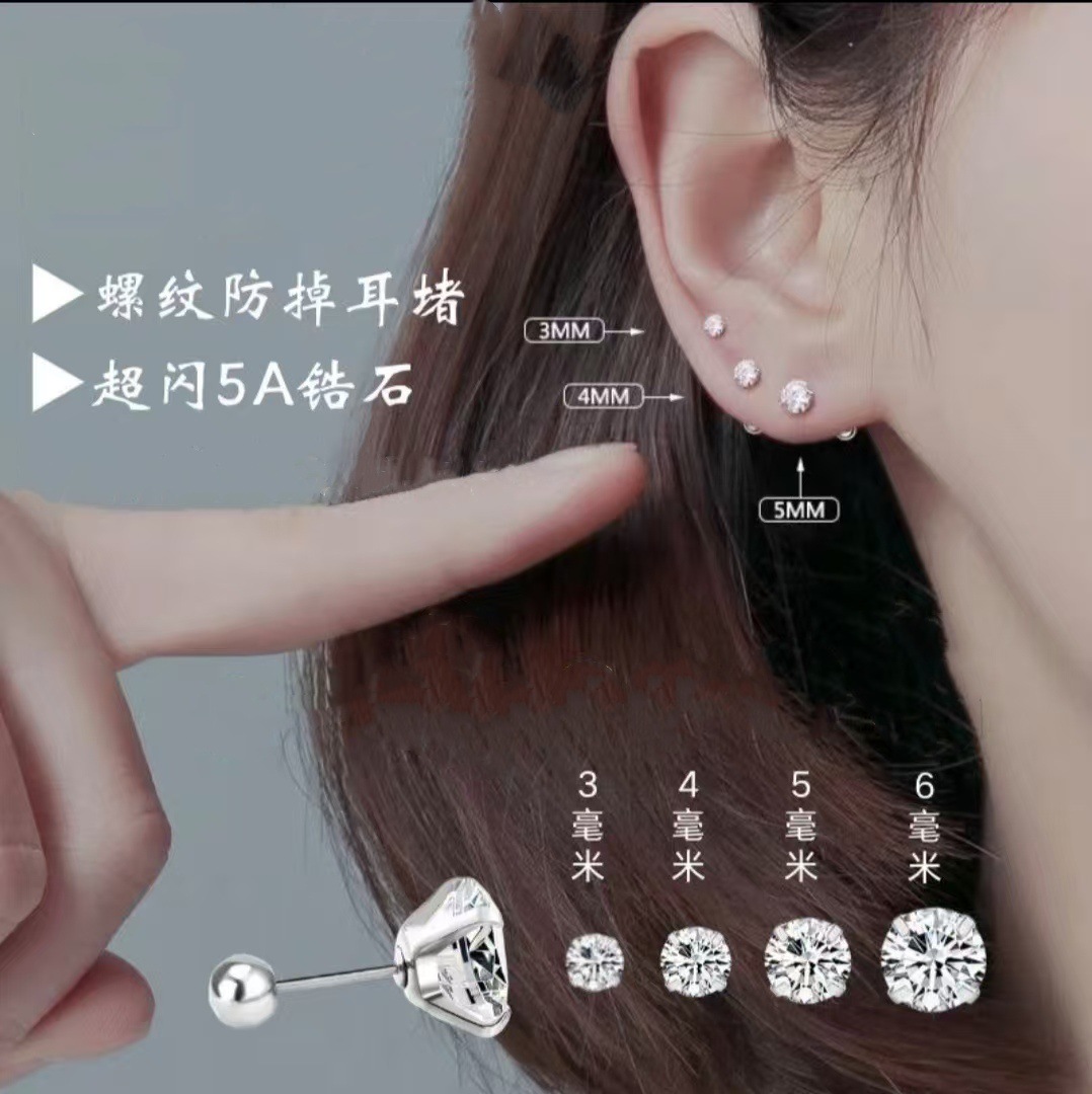 925银针粉钻耳钉女超闪锆石耳蜗钉养耳洞睡觉免摘螺丝拧扣耳骨钉
