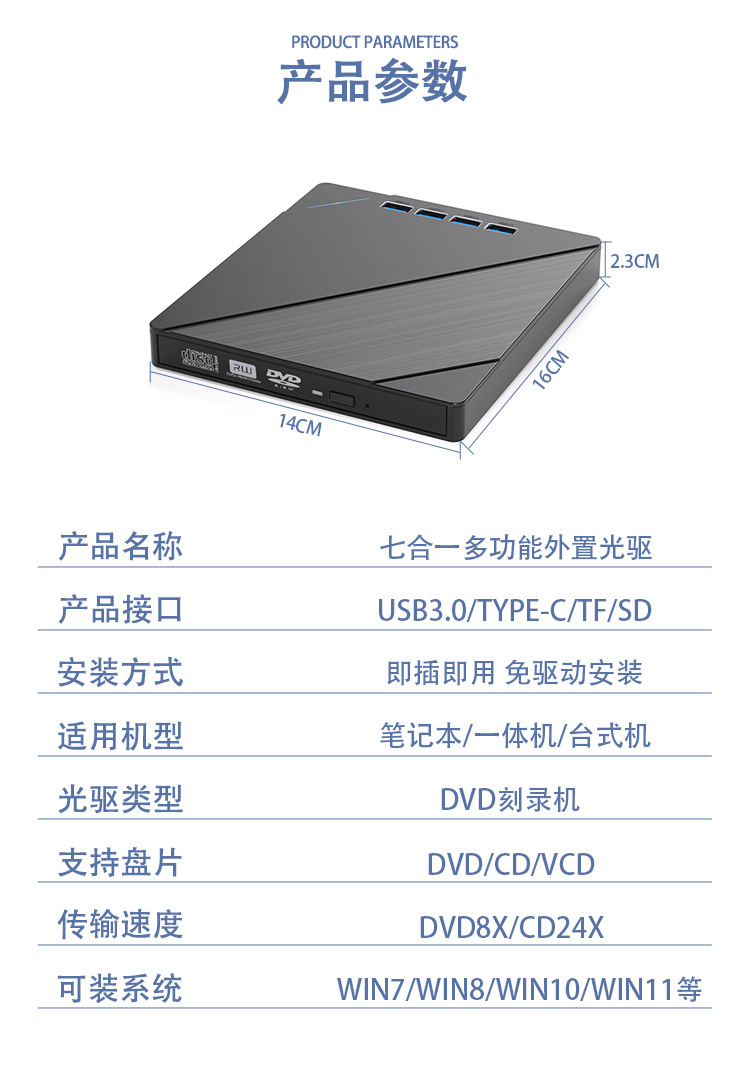 多功能外置光驱刻录机七合一USB/TYPE-C外接笔记本电脑